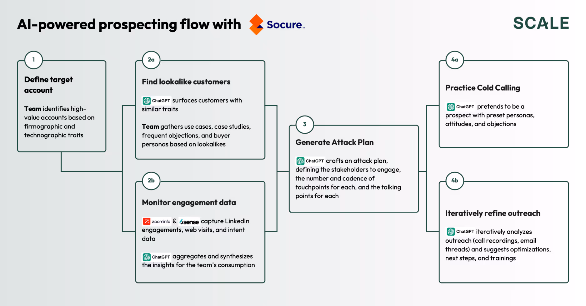 AI adoption: In addition to using some of the AI features offered by its existing tools (e.g., 6sense, ZoomInfo), Socure’s SDR team leaned heavily into leveraging ChatGPT throughout its entire prospecting workflow (account research, message drafting, mock calls).