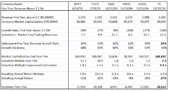 The table below shows five of the most successful technology and internet companies of the last twenty years, and the year that each of them first passed $2B in revenue, Microsoft (1992), Cisco (1995), EBAY (2003), Yahoo (2004) and Google (2004). The table shows some key performance and valuation metrics for the companies, starting with the revenue and revenue growth year for the $2B+ year as well as revenue growth and valuation five years later. Then for comparison, the table shows current numbers for Facebook, based on publicly leaked information. The key points are: