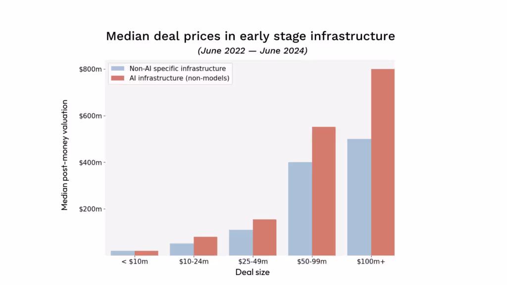 Crazed hype driving irrational valuations is not the only factor to blame here. It’s worth remembering that during platform shifts of the past, the hardware layer was mostly left to the hyperscalers. But today, in addition to the model providers, many AI infra startups like Together.ai, Fireworks, and Modular also involve expensive hardware build outs that demand massive rounds. The semi-fixed relationship of valuations and capital in venture markets mean that these megarounds have led to unprecedented valuations across AI infra, with surprisingly little adjustment for the associated risk. The results have created extreme price expectations and distortion in the rest of the market.