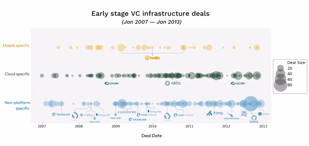 However, investor behavior in the early days of cloud and mobile did not reflect patience or prudence that aligned with these trends. While very few platform shift-specific infrastructure startups funded between 2007 and 2012 would yield multibillion dollar outcomes, there were nearly fifteen infrastructure companies started elsewhere in the market that would. It was not that money dried up for startups that were in the latter group, but the number of deals done in mobile-specific, cloud-specific, and non-platform specific infrastructure was in no way proportional to the number of outcomes each category would ultimately yield.