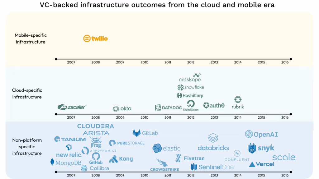 The way that investors have explicitly demarcated and priced AI infrastructure as a category suggests that the prospective opportunities merit consideration as an entirely separable and exceptionally lucrative market compared to the rest of infrastructure. But if history serves as a lesson, these platform-specific infrastructure bets do not actually bear fruit the way we think they do. And as we look back at the opportunities that did yield generational outcomes during these periods, it is worth thinking about what they did right and what signals point toward success for early infrastructure startups today.
