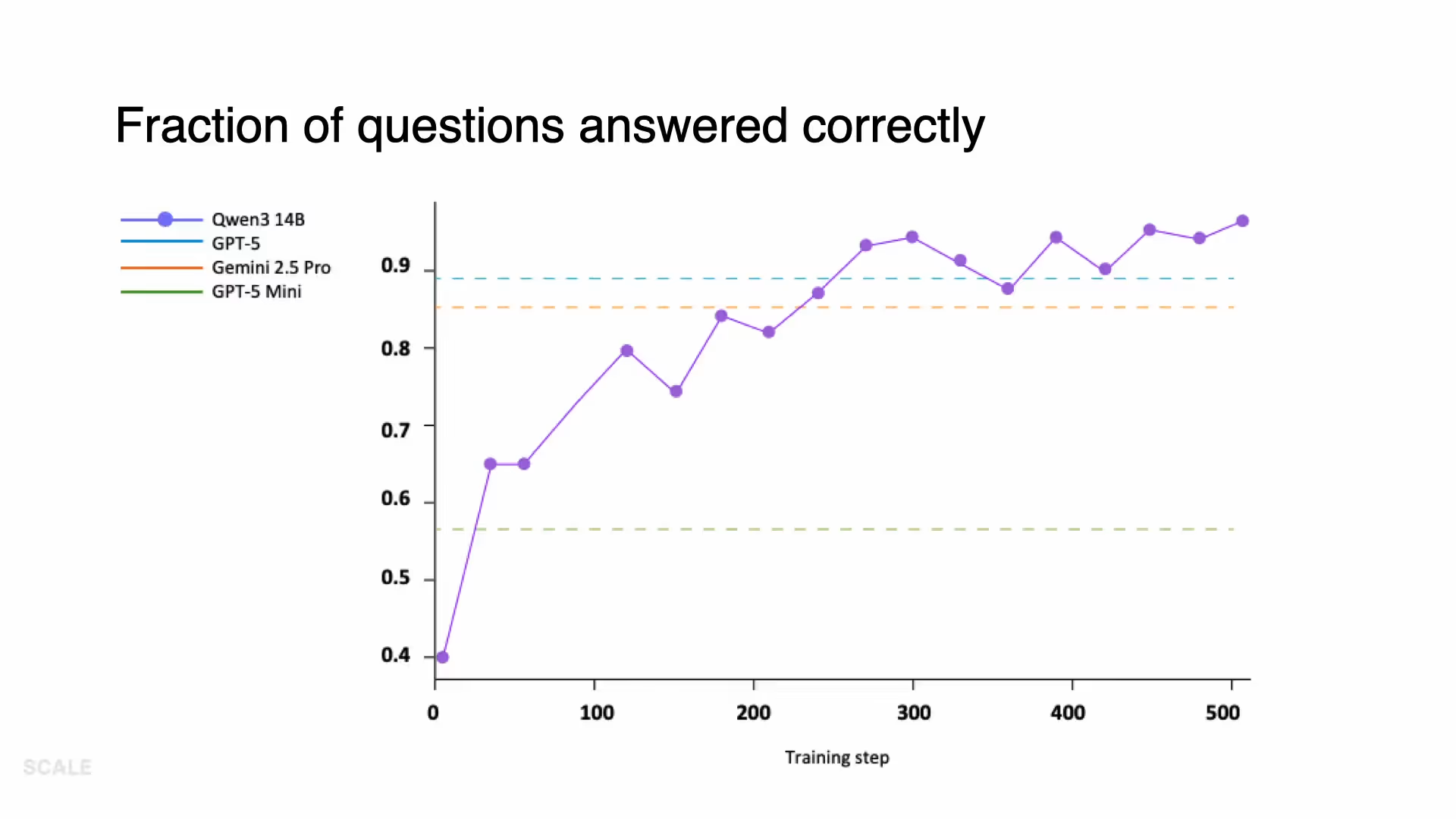 What good is better speed and cost if it gets the answer wrong half the time? Well, if we let QWEN 14B explore and try the task a bunch of times and reinforce its own learning, it quickly surpasses all other models. It’s as if it’s living at hyperspeed, and though it does not initially know the task, it can run a dozen simulations before other models have finished thinking, and become an instant expert.