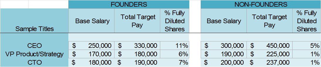 The blog post from Startup Compass I mentioned earlier provides average data for founders, regardless of position, but pay for executives vs. individual contributors, or even for various executive positions, varies widely. An important data point that Startup Compass did not address is that founders make much more compensation in equity than similar executives who come later. (see example below)