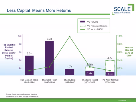 The single slide below tells the story. From 1986 to 1994, annual investor commitments to venture capital funds calculated as a percentage of GDP were under .1% of GDP. The result was a positive investment climate when venture funds delivered significant returns to investors. The average return of the top 25% of funds, (i.e. the return of the best funds) was 5.3x in that period. Call this the real Golden Years of venture capital. In 1995, the rules changed with the Netscape IPO, and the result was the Gold Rush period. Even though the capital invested doubled, the hugely strong IPO market meant that returns soared to 9.3x invested capital, an almost unheard of rate of return for any asset class. Capital poured in until inevitably, the rush of hot money killed the business off. In the year 2000, capital invested was 1% of GDP (or ten times the rate it had been only a few years earlier) so once IPO’s stopped, returns plummeted. Most of these funds have not yet returned the capital invested in them, and our estimate here of a 1.7x for the top quartile strikes most LP’s we talk to as optimistic.