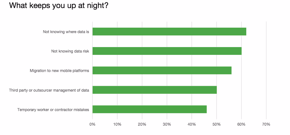 - Data breaches are still a top concern, and are on the rise. This is amplified by a lack of confidence that they know where their sensitive data is in their company (almost two-thirds didn’t know), or can quantify the risk to sensitive data in databases, unstructured files or big data clusters.