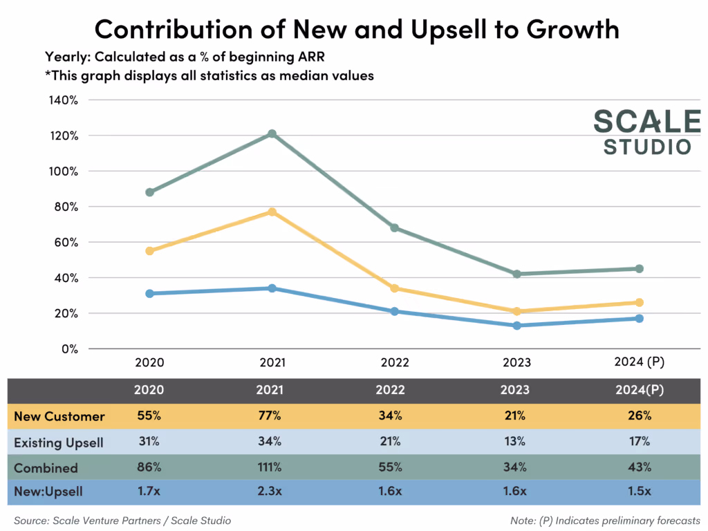 - Where is the growth coming from?: Startups can’t grow without new customer acquisition, but the ratio of new to upsell as a percentage of growth has changed. Expansion of the customer base will continue to play a bigger role in 2024 than in years past.