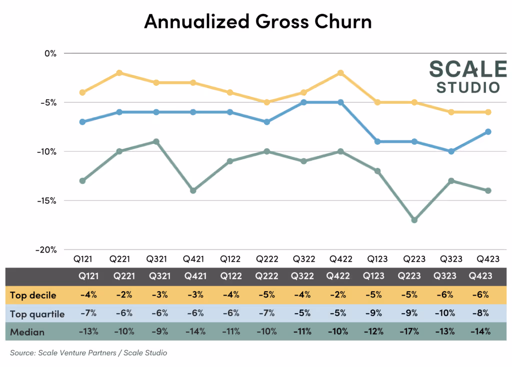 As a whole, we saw performance bottom out across all metrics in Q223, with Q323 emerging as the first quarter of improvement for many companies. Churn hit a three year high in Q223, and while we have seen performance improve at a slower rate from Q323 to Q423, the most recent quarter still marks a 3% improvement over Q223. This is roughly in line with the long term median of 13% annualized gross churn. In this case, we see stability as good news on its own. With these numbers in mind, we can reasonably credit a focus on retention as the foundation of sustainable growth.