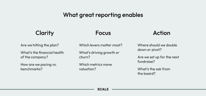 Board reporting is, on the surface, creating a deck. But it’s really an exercise in getting clear on your business’ financial story such that you can even report it. The very act of having to report can help align your go-to-market team and help you identify and solve problems, as when you notice that you’re about to report a shortfall in pipeline. You can anticipate the board’s questions about what that means for next quarter and hold a strategy session with your head of marketing about what to do.