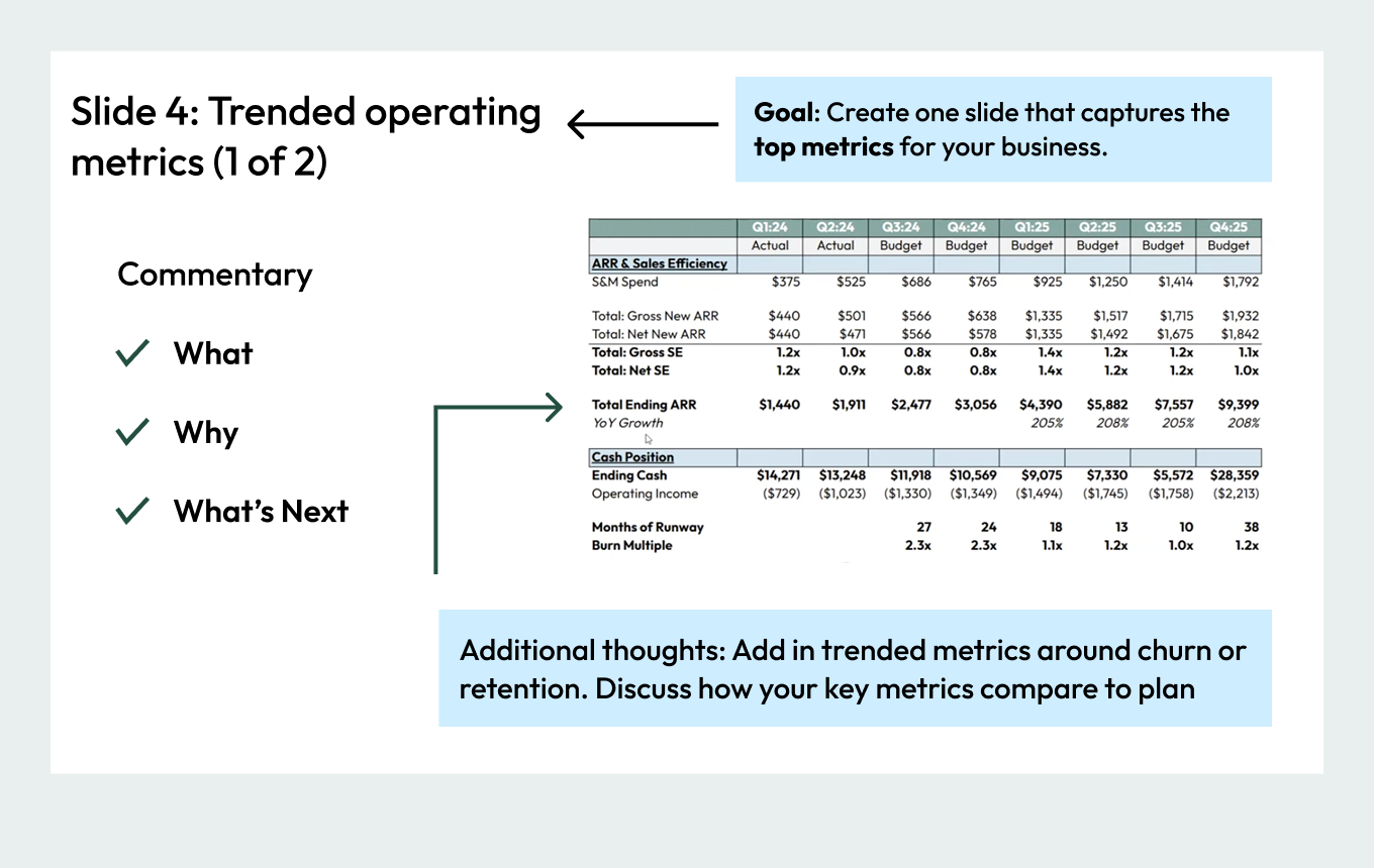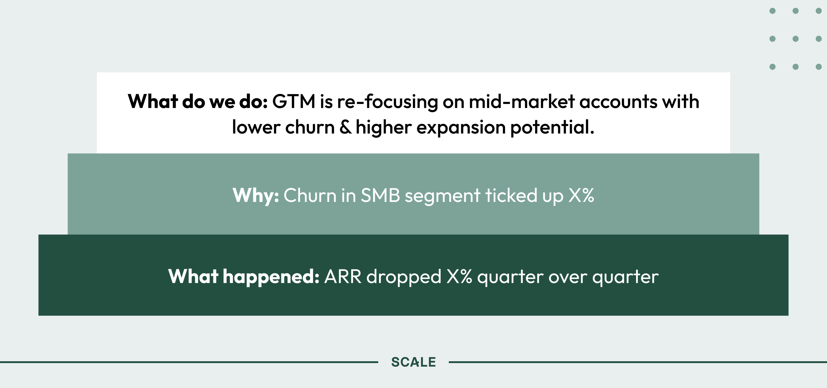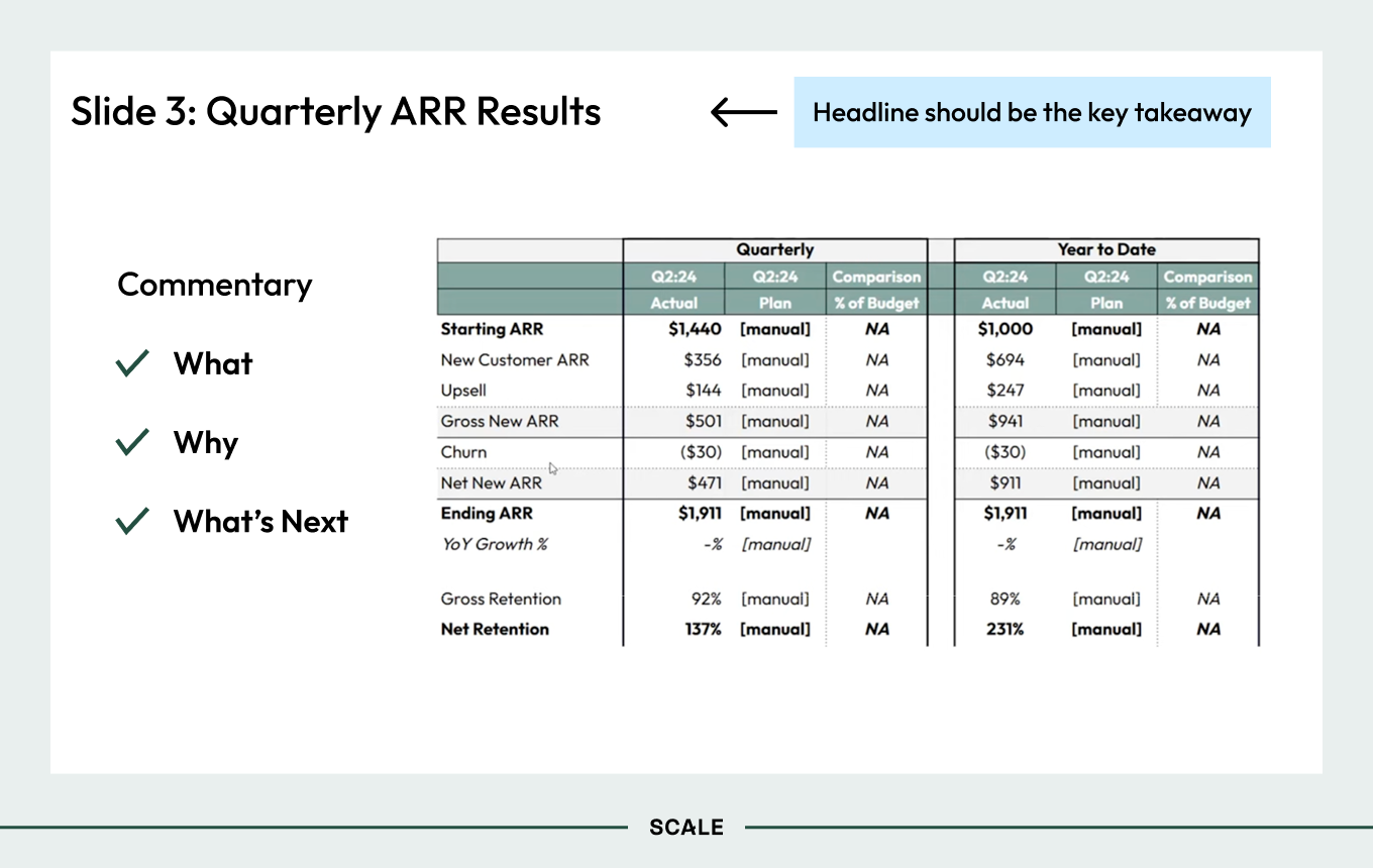 In your quarterly ARR results, always include gross and net retention. This can tee up in-depth conversations for your go-to-market leaders later on. For example, “Here are the numbers, and we’ll cover the full plan to address the churn issue later in the go-to-market section.”