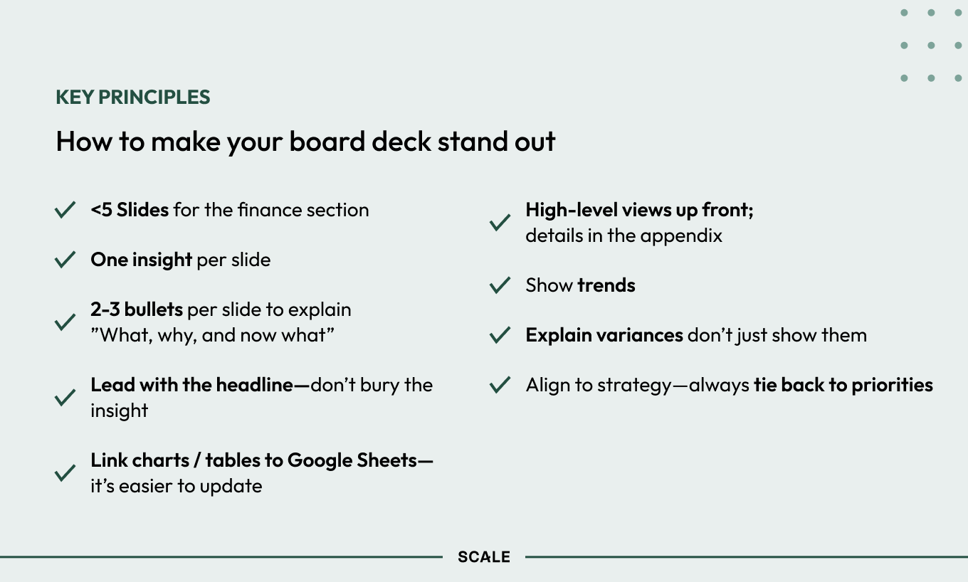 M.G. Thibaut has run finance teams at DroneDeploy, Copper, Ruby Ribbon, Yahoo, and elsewhere, and believes strongly that even your font choice says something about how you run that finance operation. Carefully proofread and fact-check and give your deck a consistent design style. Create a style guide, stick to it, and keep all numbers in 12-point font or greater so it’s readable, no matter where the board dials in from.