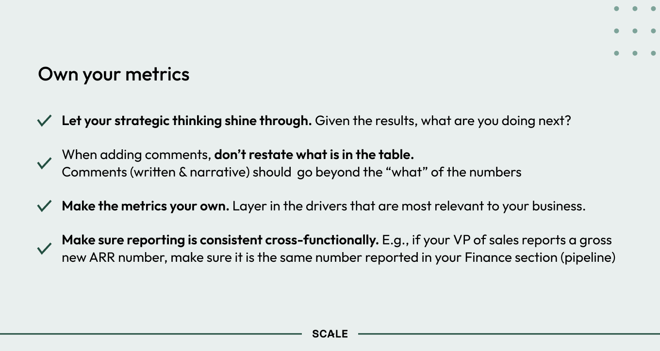 Also ensure that your reporting is consistent cross-functionally. If your head of sales reports a gross new annual recurring revenue (ARR) number, ensure it is the same number that appears in your finance section.