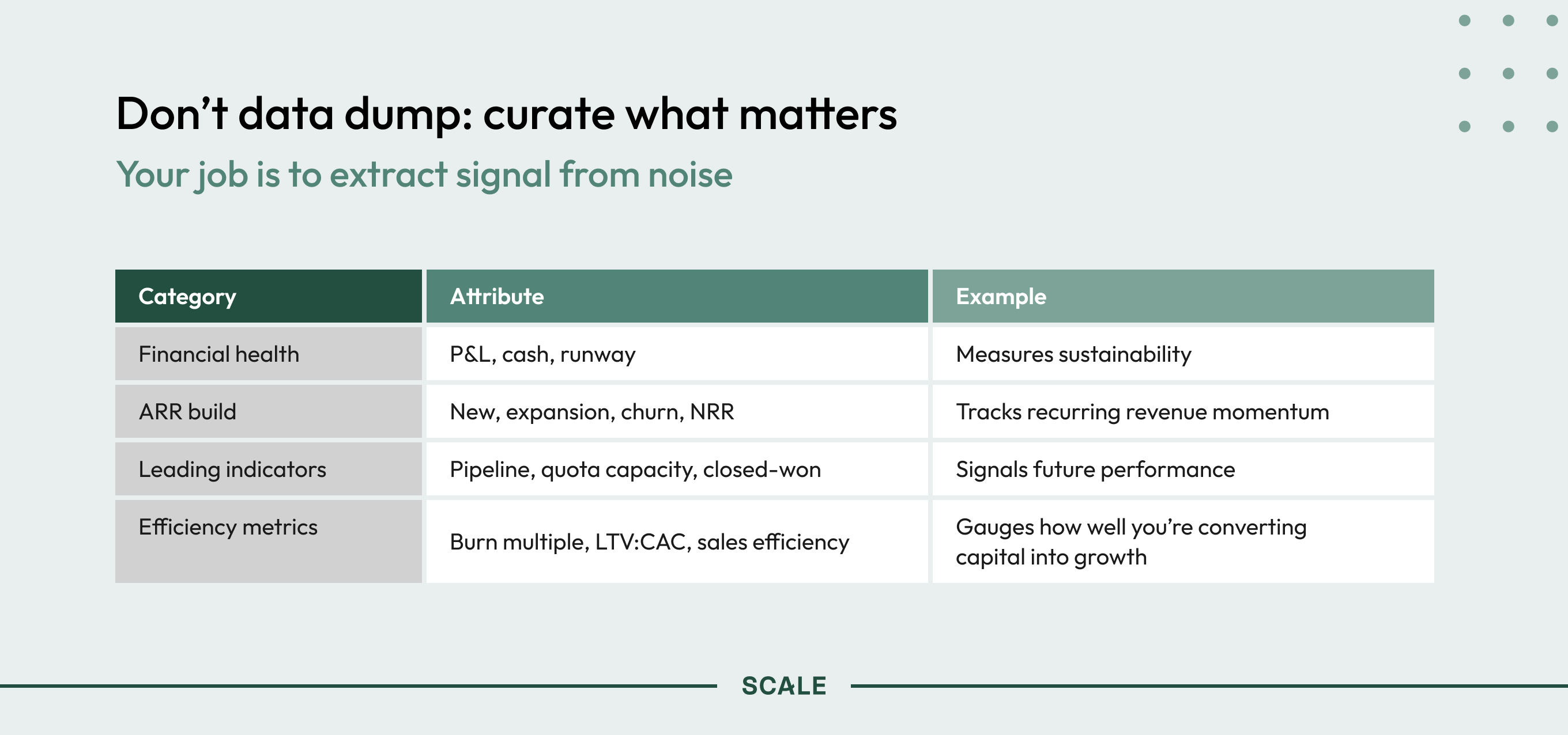 “Don’t dump data, curate what matters,” says M.G. “Your job is to extract the signals from the noise.” You want to be presenting what the board needs to hear—about momentum, growth, pipeline, and quota attainments. How well you are converting pipeline into closed-won business, and so on. In short, how well you are converting the capital you’ve raised into growth.