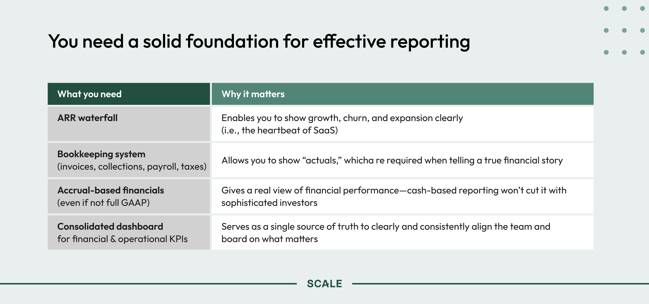 This means you’ll need to get the business on accrual financials, enact a solid period-end close process, produce actual financial statements, and maintain a dashboard of key indicators—for what good are numbers if people aren’t trying to influence them between board meetings? All this allows you to present the foundational numbers your board needs, like the ARR waterfall.