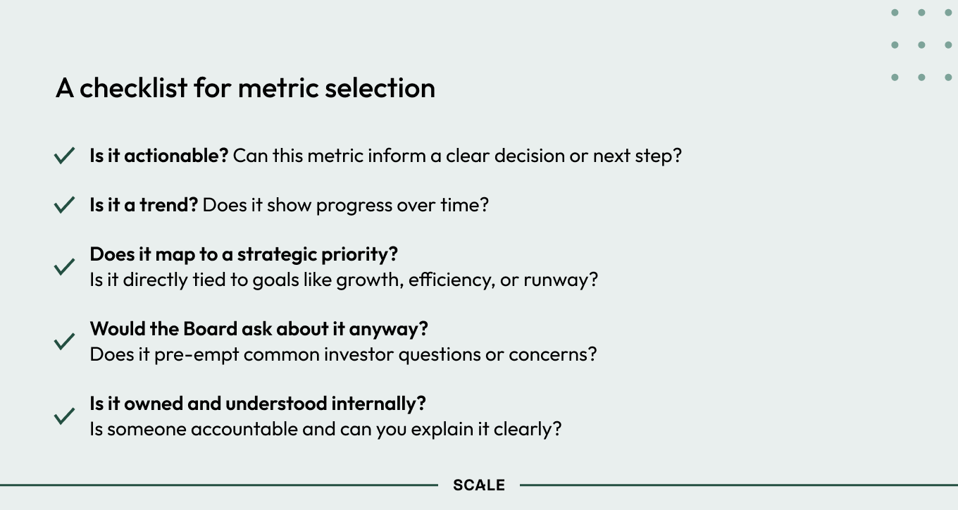 There are many metrics you could choose to track. How do you decide? Below is M.G.’s checklist. If something is important but not owned or understood internally, such as headcount or cost of acquisition, that’s an opportunity to bring to your executive team.