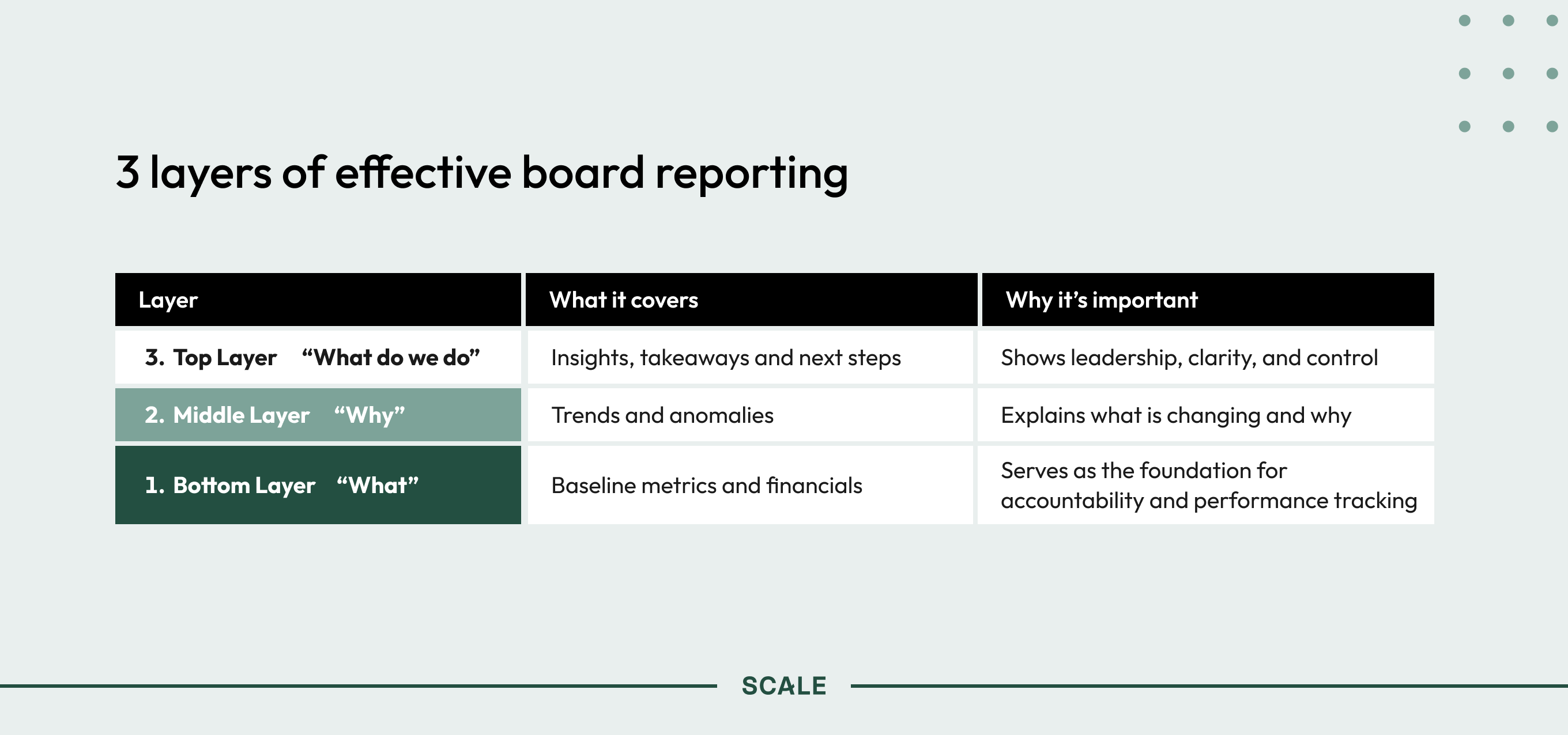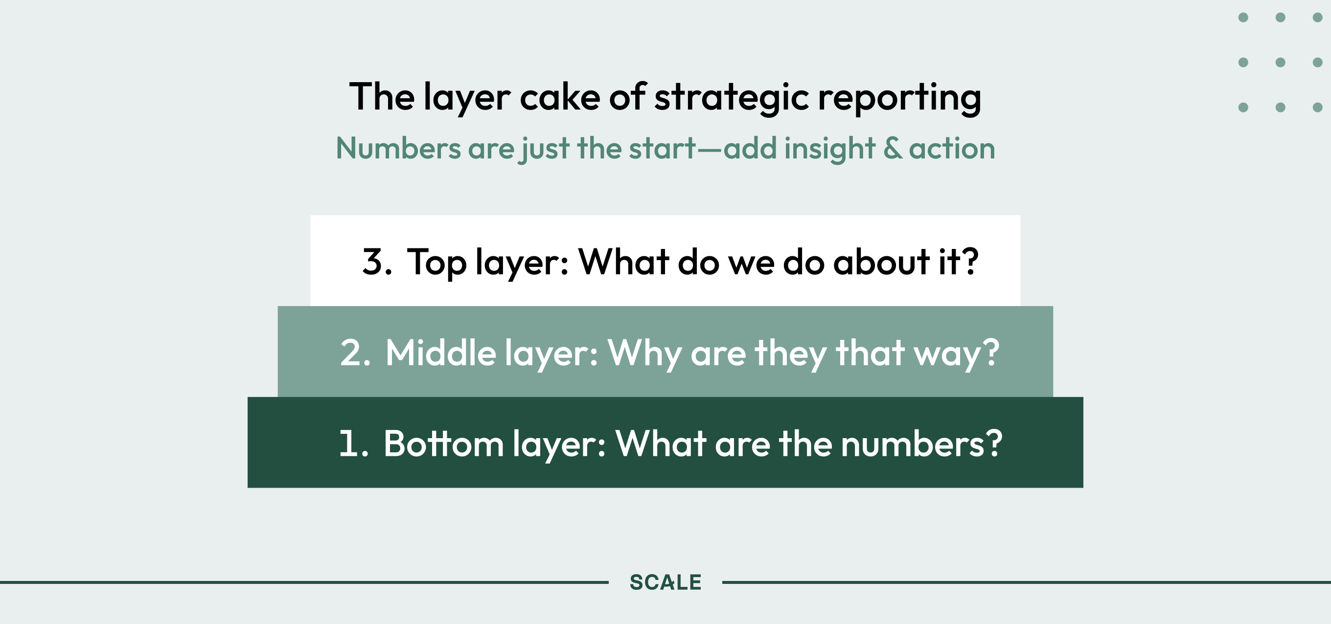 The bottom layer is where most financial executives spend their time—trying to put the reports, workflows, and integrations together to understand what is happening. But it is the top of the cake that demands most of your attention, and what the board most needs to know. The bottom two layers only matter insofar as they enable you to speak to the top.