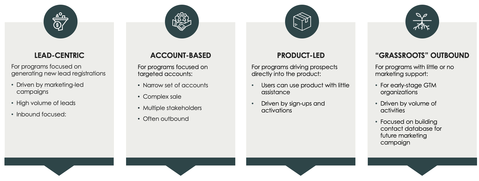 This collection of funnels is designed to help you manage and report on your demand generation efforts. The four funnels represent the most common demand gen models. You can choose the funnel(s) that make the most sense for your business and keep in mind, it’s common for organizations to use multiple funnels. For each funnel, we provide a recommended set of milestones that you can start using today or modify to best suit your business.