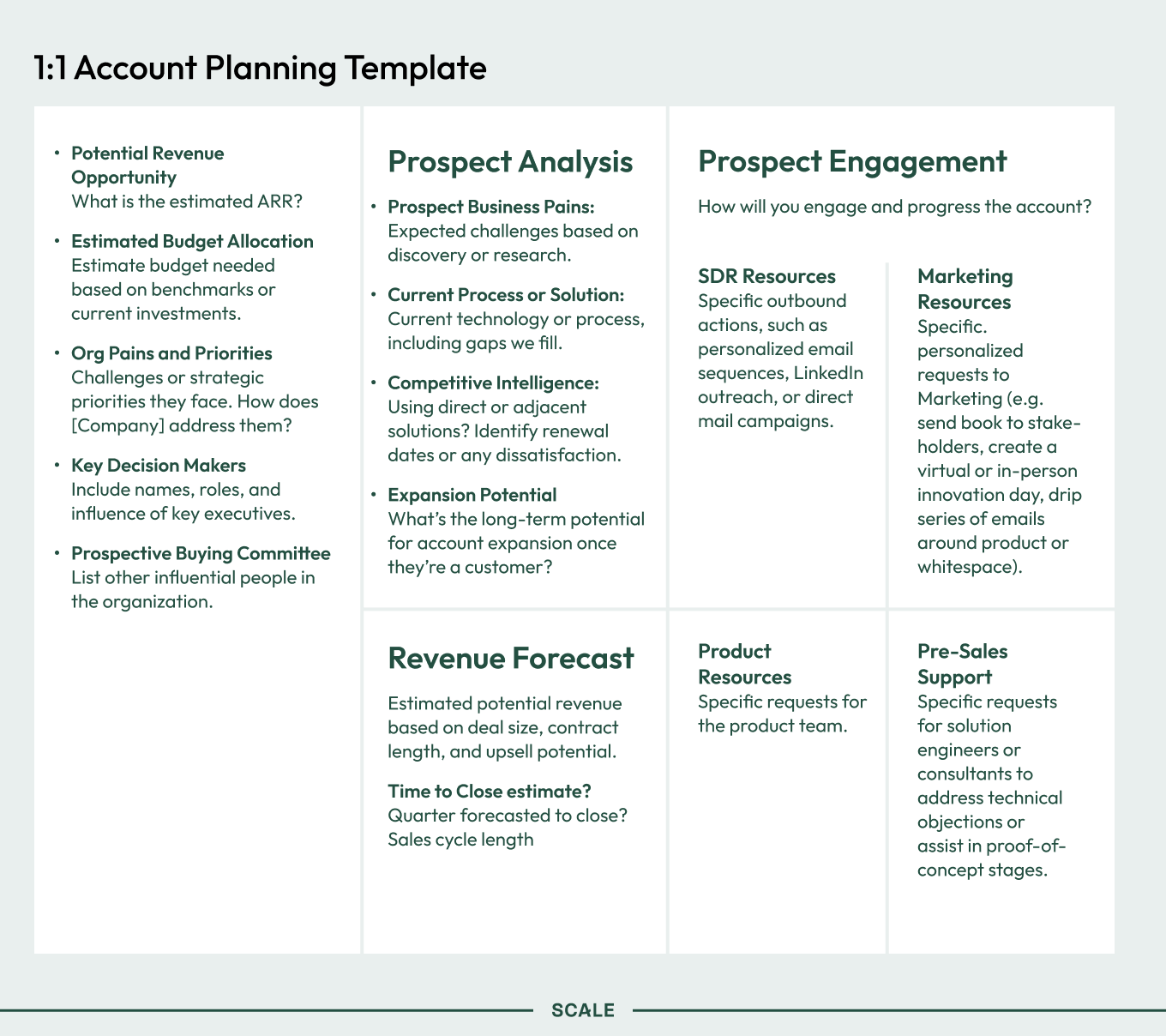 To start, Blake created a template for every seller to fill out and scheduled a twice-monthly pipeline sync. In that first meeting, he asked the account executives and sales development reps to fill out the template for five accounts in their top 25.