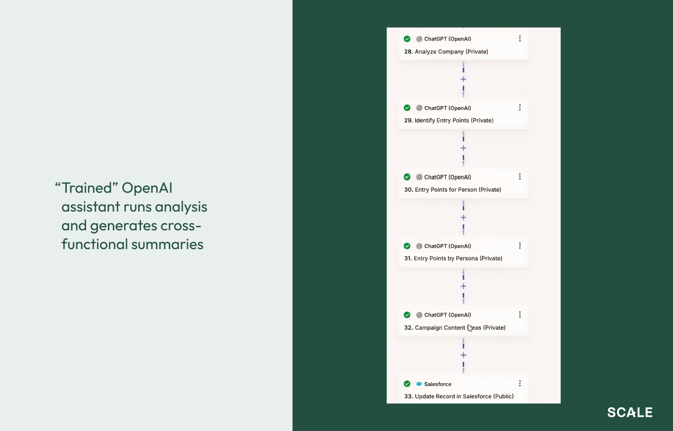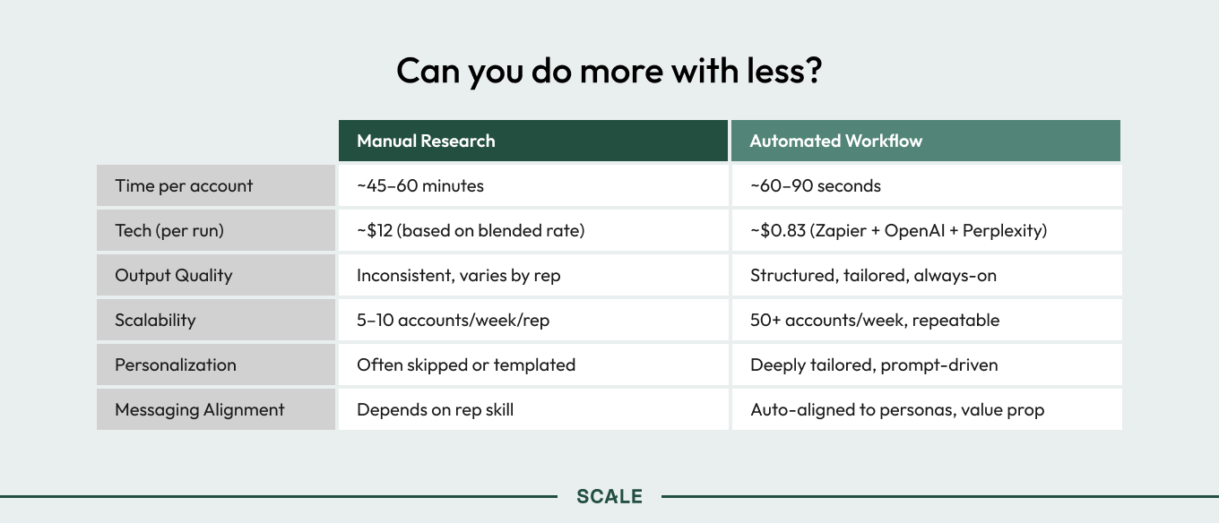 “Individual research didn’t scale for us,” he says. “After realizing that, our main idea was to drive account research using no-code tools and LLMs so we have that cross-functional value of research in a standardized way.”