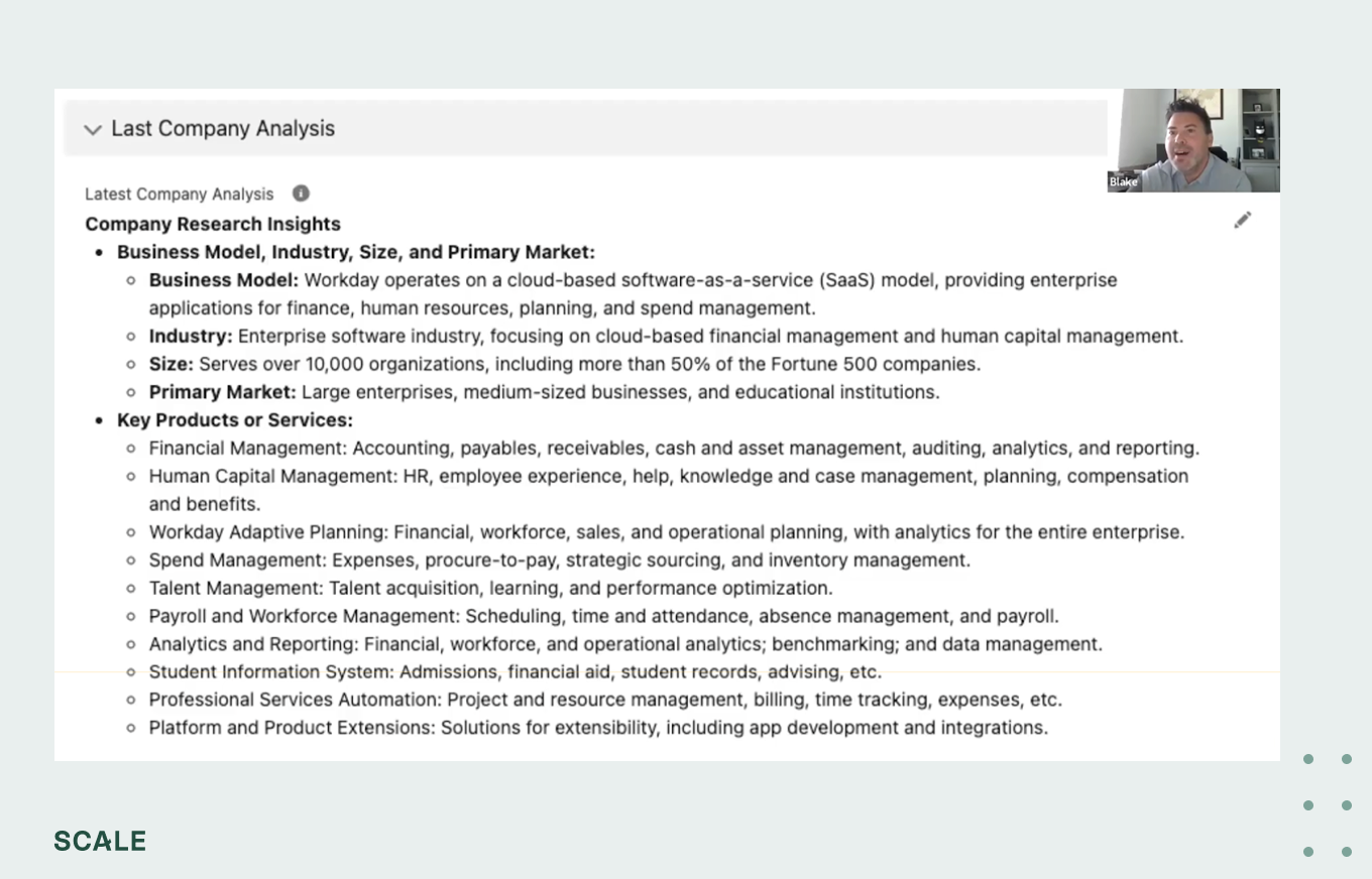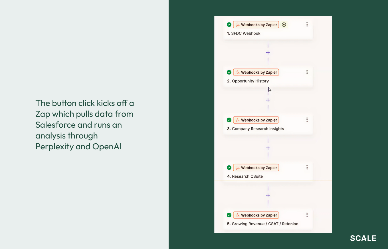 Blake started with one-off prompts. But eventually, he and the team built a series of Perplexity spaces and custom GPTs that did this work on their own. He then chained those research phases together with no-code software such as Zapier and n8n and placed a button in Salesforce titled “Run company analysis.” Once pressed, it produced research automatically.