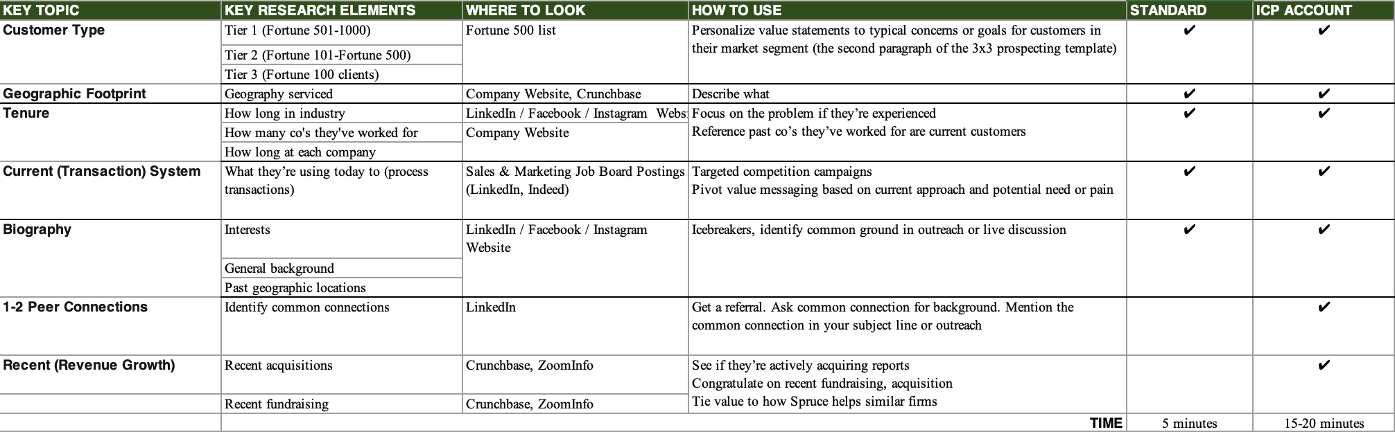This is a basic tool for sellers to quickly, consistently, and effectively personalize prospecting and plan discovery based on knowing where to look and how to apply quick targeted research. It helps sellers maximize their time, increase response rates and boost confidence.