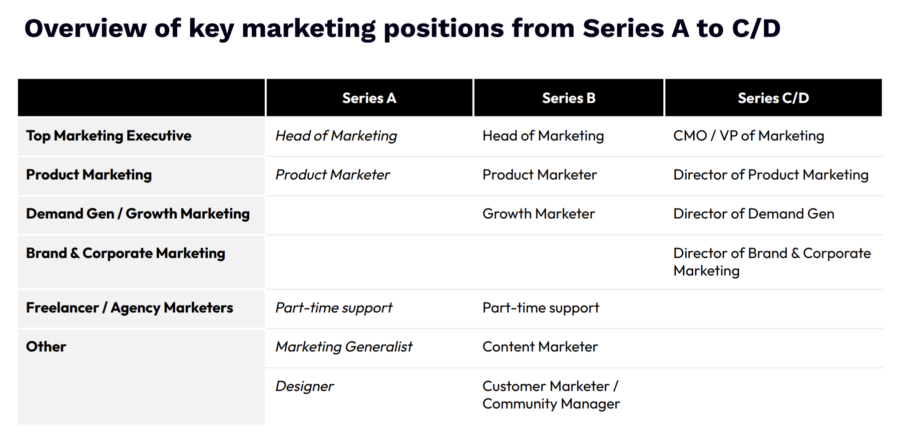 In this cheat sheet for scaling your marketing organization, Maria Pergolino, 3x CMO and Scale EIR, explains how to grow a marketing team from Series A to Series C/D, how to distinguish between CMO-level and Director-level marketing talent, and how to divide marketing responsibilities between brand/corporate marketing, product marketing, and demand generation.