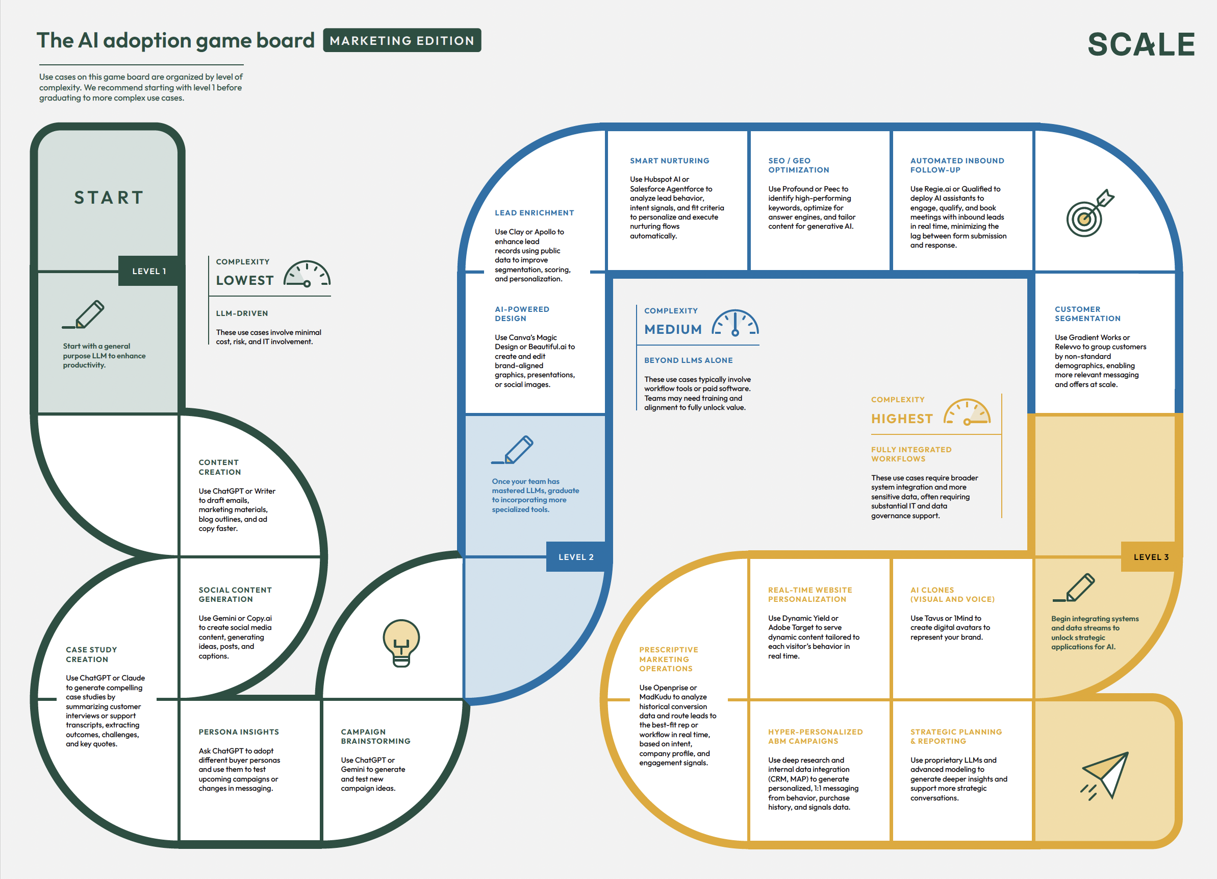 Of course, in reality, there isn’t one path to AI maturity. But it also doesn’t make sense for us to visualize the hundreds of possible paths because they are all learning steps toward a greater goal: Better identifying our buyers and helping them choose us. That’s the final square on the board.