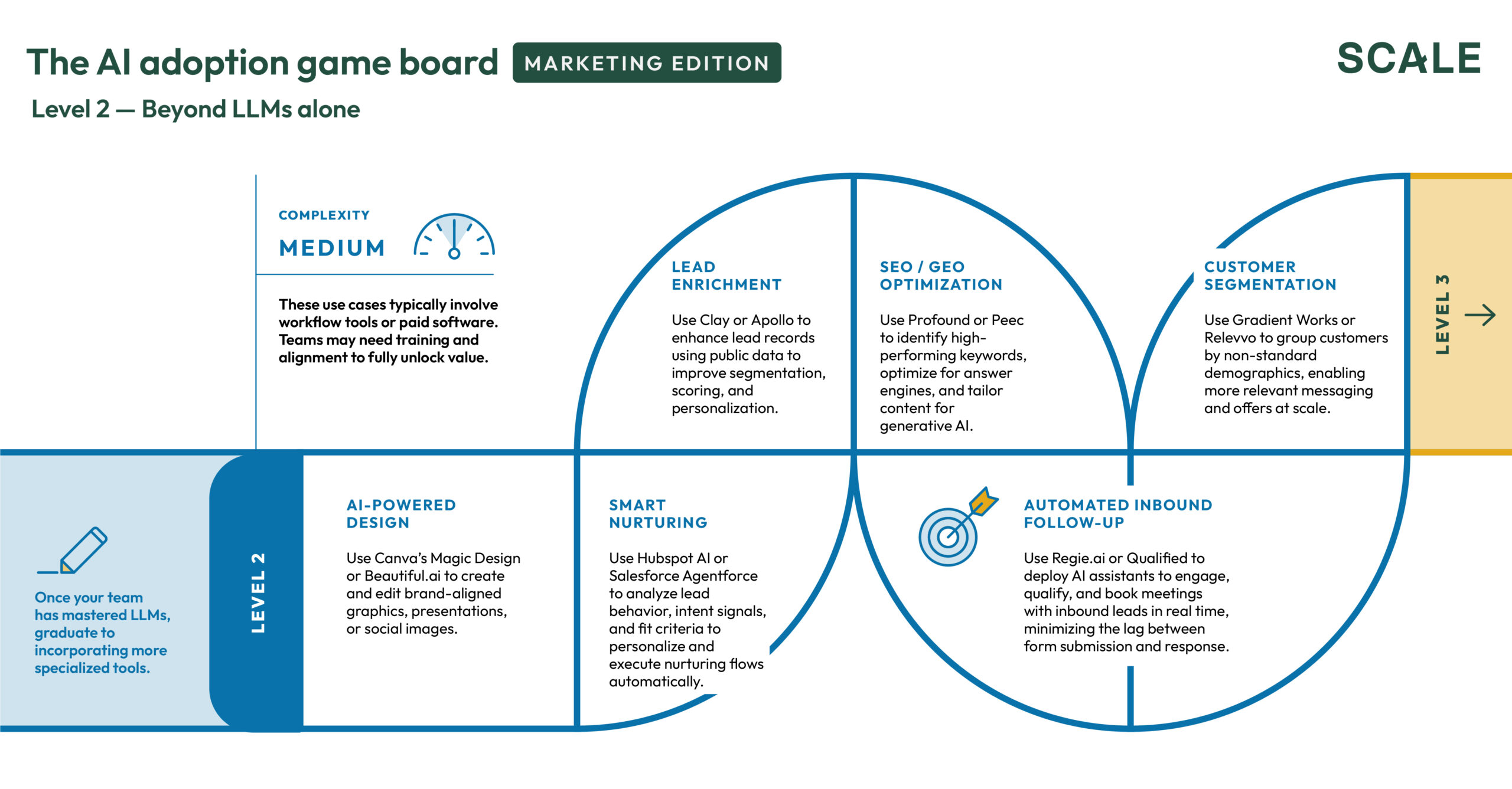 In the second level, you move on to workflows and use cases that typically involve paid software. Here, your team may need training to unlock AI’s value. For example, using smart nurturing, enriching leads, and bulk operations.