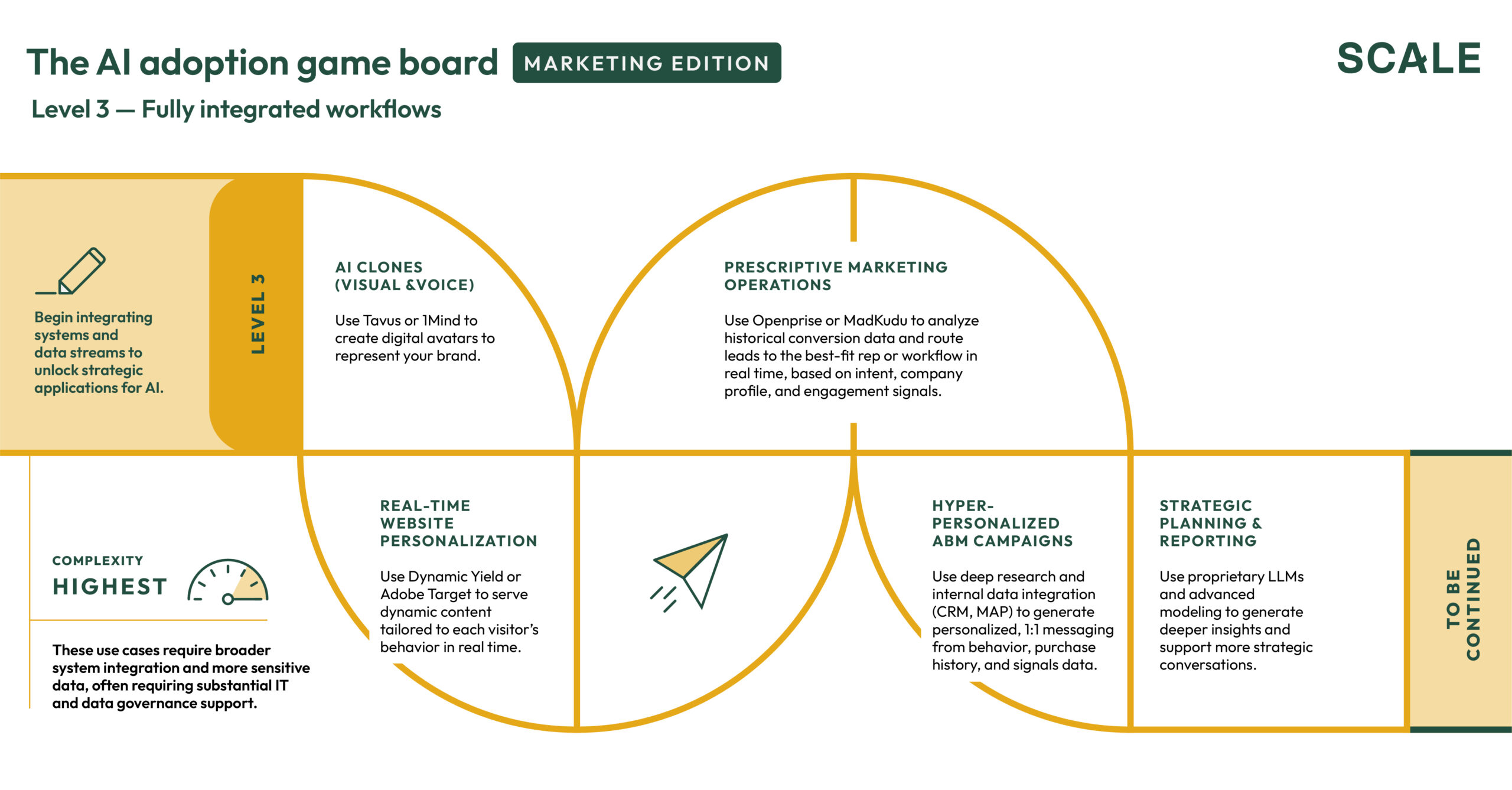 In the third level, you begin integrating systems and data to achieve even more. Here, you use AI personalization for the website and maybe ABM, and experiment with synthetic personas and voice clones.