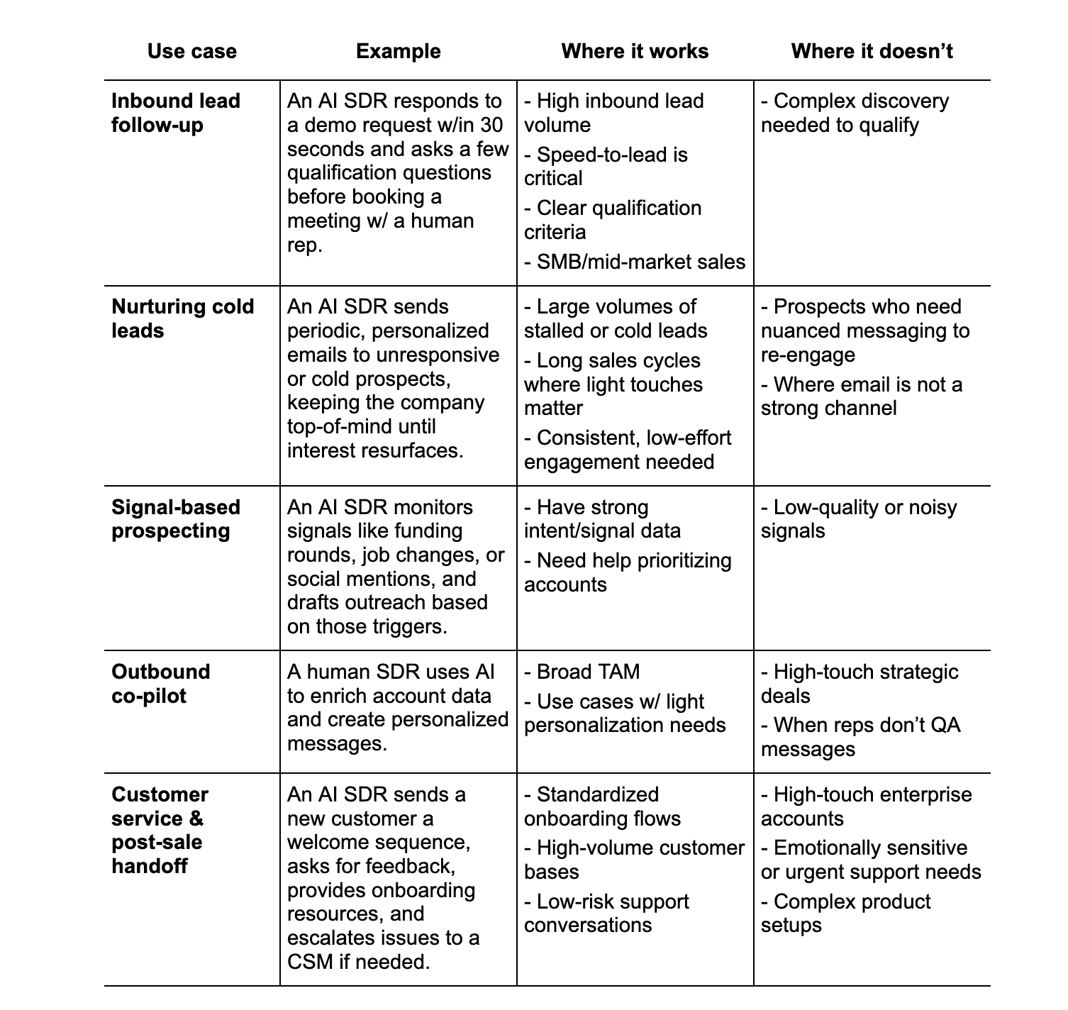 - High-performing teams are deploying AI SDRs to support inbound lead follow-up, nurturing, and even front-line customer service; essentially, anywhere speed and consistency are critical.