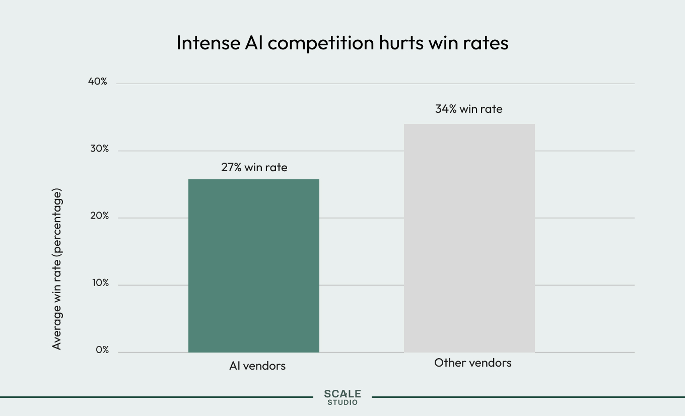 As a result, though the deals you win close quickly, winning deals overall is harder. In general, AI vendors have an average win rate about 20% (7 ppt.) lower than those of their non-AI peers. This is the first drawback of selling AI.