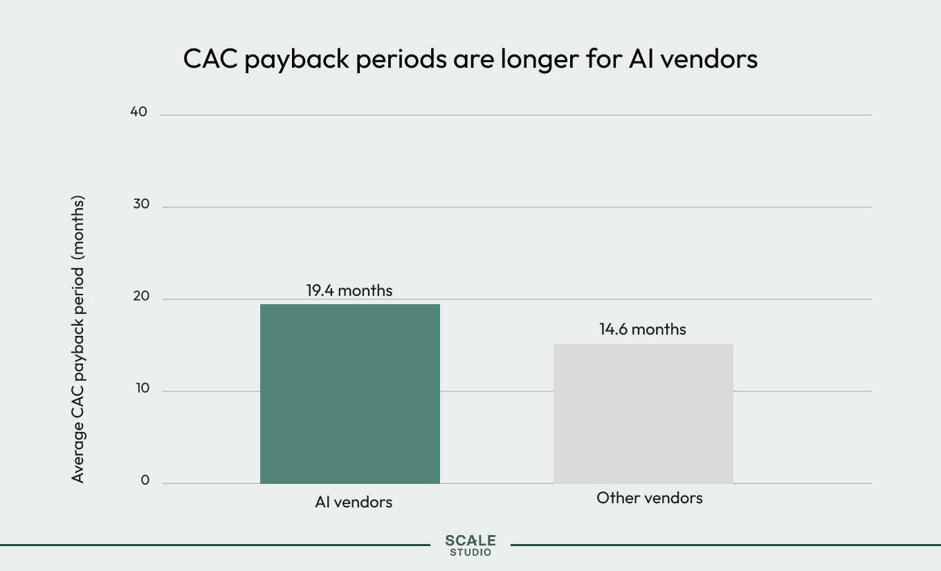 The other downside is the (much) longer CAC payback periods.  In our data, AI vendors’ payback periods are almost five months longer than those of other vendors, a trend we attribute to (at least) three factors.
