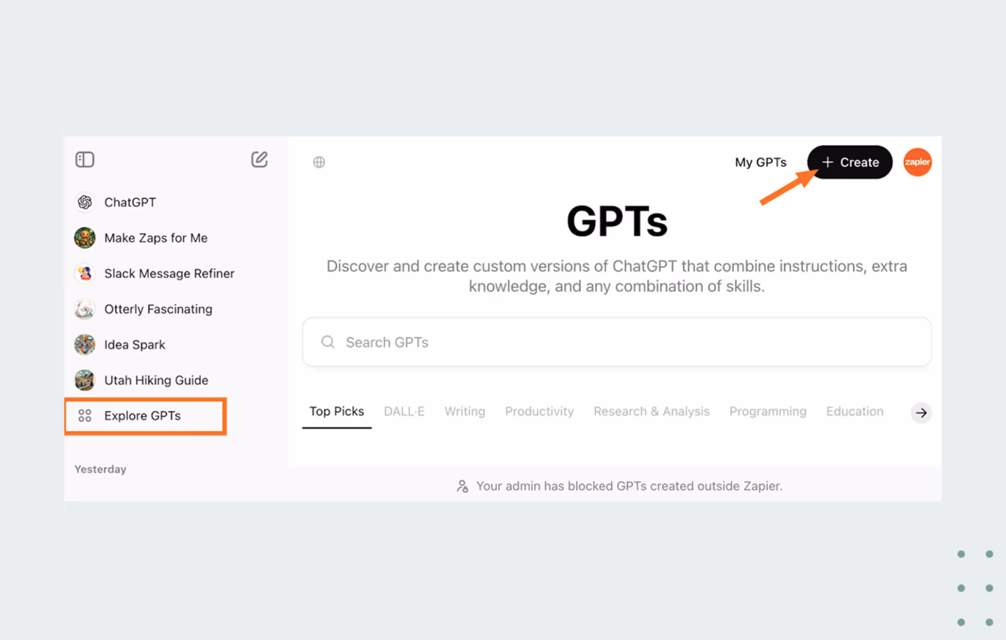 Open your work instance of ChatGPT and enter a prompt describing what you are trying to do. For example:“I need my SDRs to have a strong understanding of our superintendent persona within the construction vertical and I want a research agent that’s going to write messages for them that reliably get positive responses.”Click the “Create” button in the upper right corner, which opens up a wizard. Click “Create” again.
