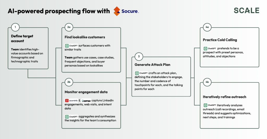 Company background: Socure is a Series E company selling identity verification and fraud prevention software to enterprise customers in financial services, ecommerce, healthcare, and other industries.GTM strategy: Socure uses an account-based strategy to target named accounts in distinct verticals / segments.Motivation for adopting AI: Socure’s executive leadership team made AI adoption a company-wide priority and KPI, encouraging adoption both within and outside of the GTM organization. As Socure reduced its SDR team size from 12 to 4, it became particularly necessary for the sales development team to use AI to do more with less.AI adoption: In addition to using some of the AI features offered by its existing tools (e.g., 6sense, ZoomInfo), Socure’s SDR team leaned heavily into leveraging ChatGPT throughout its entire prospecting workflow (account research, message drafting, mock calls).AI operationalization: Though Socure’s SDRs showed some initial hesitation about using ChatGPT, GTM leadership took concrete steps to help them grow comfortable with the technology. Over time, through access to robust education, structured prompt libraries and custom GPTs, and weekly team calls to share best practices, the SDR team learned how to use the technology to improve and accelerate, rather than automate, their work.Results: By leveraging AI, the SDR team now conducts account research and planning more efficiently whilealso enhancing the quality and personalization of outreach. Despite the team’s smaller size, they set high-impact meetings aligned to strategic enterprise accounts faster today than the larger team used to. From 2022 to Q1 2025, Socure’s SDRs have increased their total opportunity value by 170%. Additionally, since adopting tools like ChatGPT, individual SDRs have started to use AI to expedite tasks outside the scope of the initial deployment, further amplifying their productivity and impact.