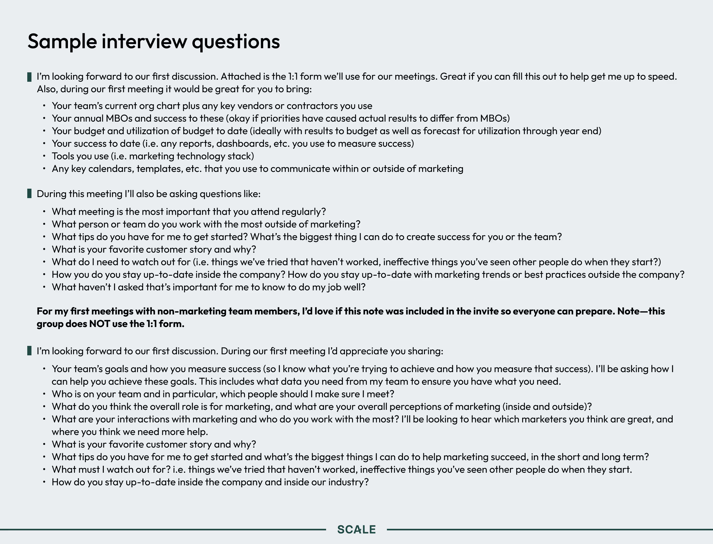 Get them from top leadership and compare people’s answers. Hopefully, those answers overlap enough to form a clear direction, otherwise you have some digging to do.Next you’ll need to know how the company is built—how teams are organized, how they make decisions, and where people draw insight from. Interview all the people on your team and your partners on related revenue teams to understand what you do and do not yet know. I know I can’t talk to everyone, so I like to send a wide survey, as well as conduct specific interviews where I ask people to come prepared.I say “interview with purpose” because you really do need to use this time wisely. You should be entering with hypotheses to prove or disprove, and digging to figure out what more there is to explore along with what you don’t know. “With purpose” means asking your interviewees to prepare things they won’t know offhand (see below) and leaving with clear answers to most of your questions.