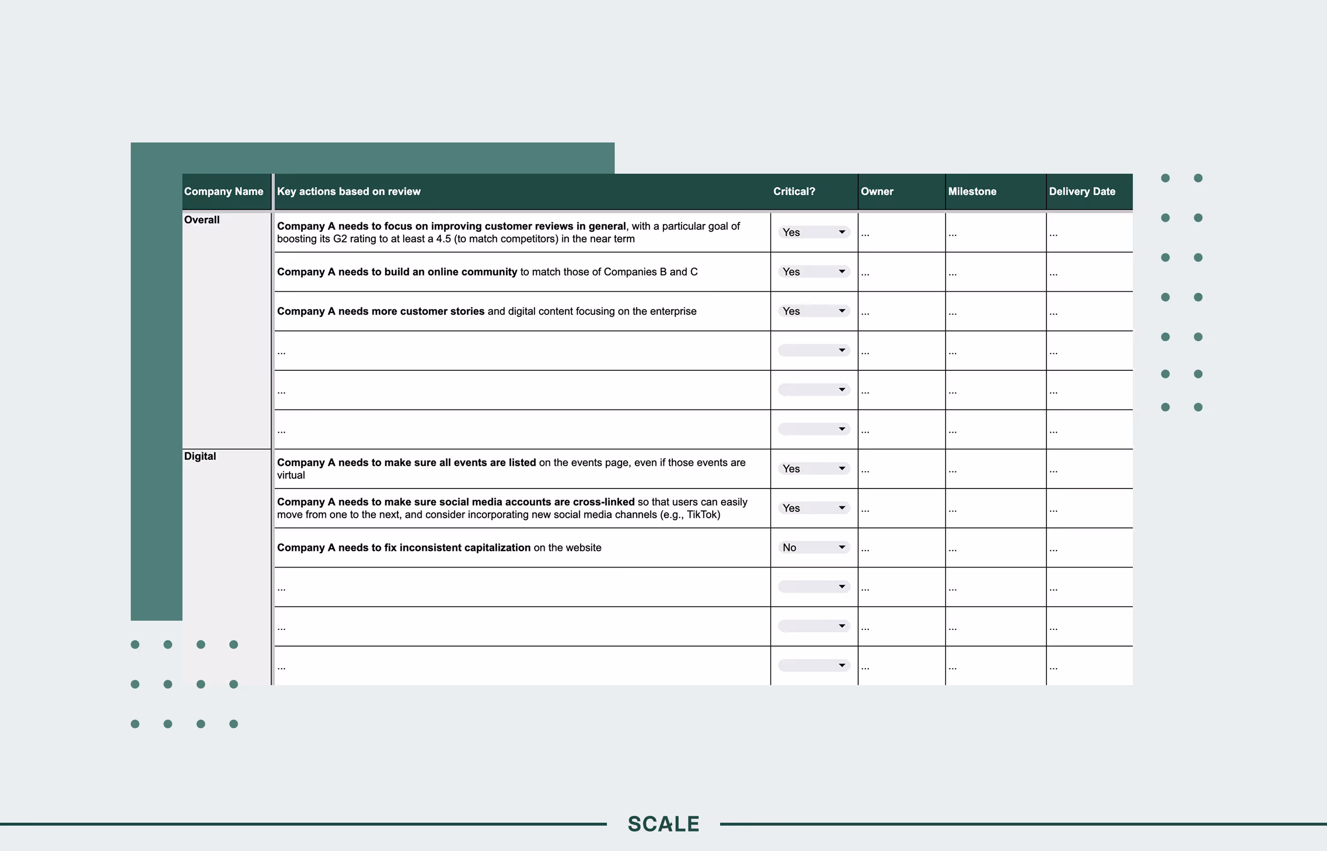 This information grows especially powerful when you repeat this exercise multiple years in a row. Sure, follower count is a vanity metric but if a competitor is growing that rapidly on all fronts, it’s a sign of momentum. I’ll also find issues with our own marketing like dead pages and messaging that’s soured. It’s a great way to emerge with a list of 10 quick wins.That’s really what you want in your 100-day plan: 10 low-effort things they could change to suddenly alter the direction of their market presence. Followed of course by longer-term goals that will really address your external assertion, like that you want to pursue a category. But your quick wins build up social capital to spend on the things you know matter.