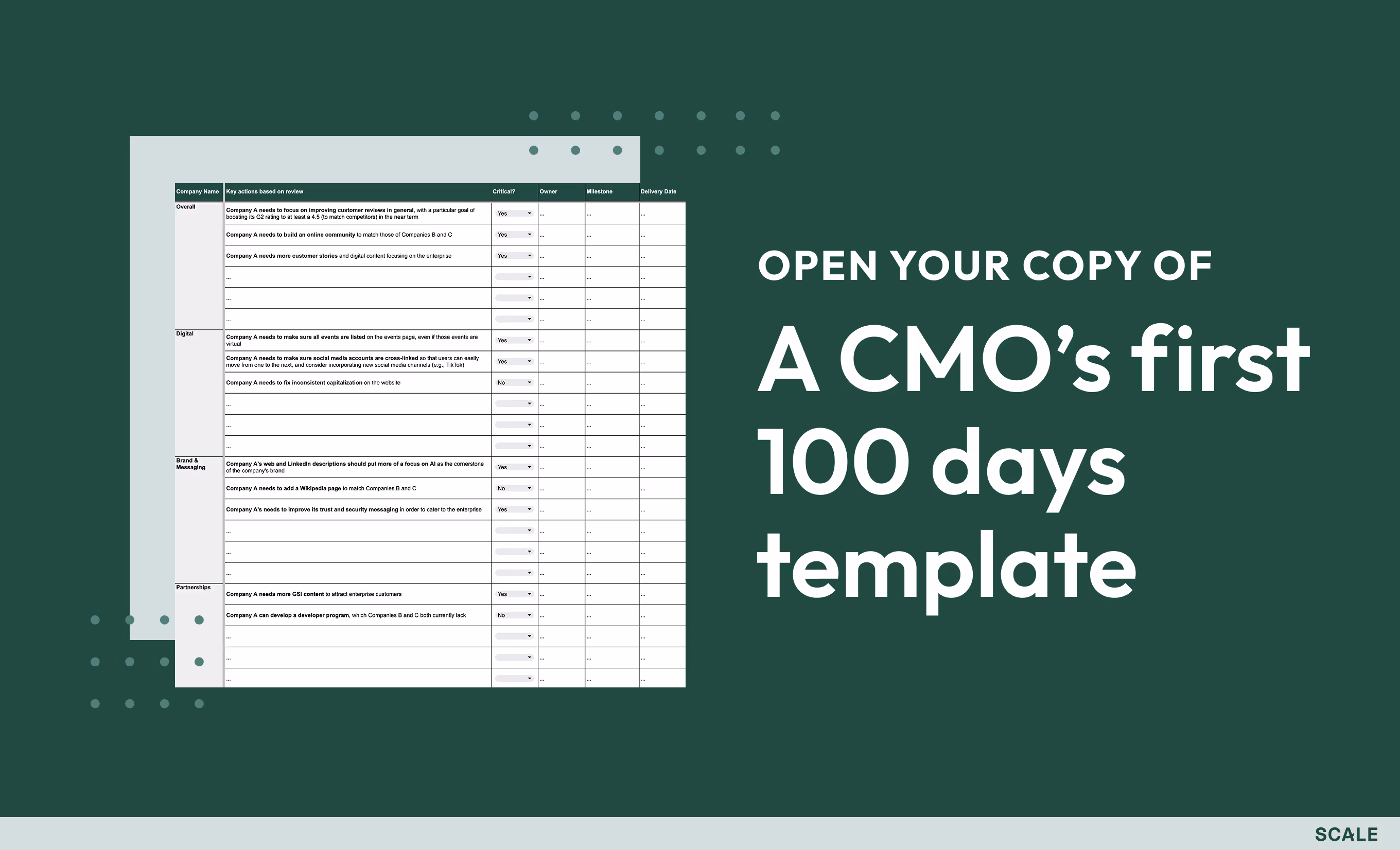By Maria PergolinoThe thing about your first 100 days as CMO is there is no step-by-step playbook. No two companies are alike enough for the same plan to apply—and that includes your competitors. Your plan must be custom. That’s why instead, I’ll prepare you the next best way, with the specific tools for drafting your own 100-day plan using external research (including a spreadsheet template) and strategies for conducting internal interviews.This is a great exercise for those considering joining or who have just joined a new company. It is also a wonderful yearly refresher for seasoned CMOs. If this process leaves you convinced of a few things, I hope it’s this: That marketing’s job is to bring the “market” lens. That you can’t delegate this type of understanding. And that all you need to arrive at the right answers is to interview and research with purpose. Let’s dive in.