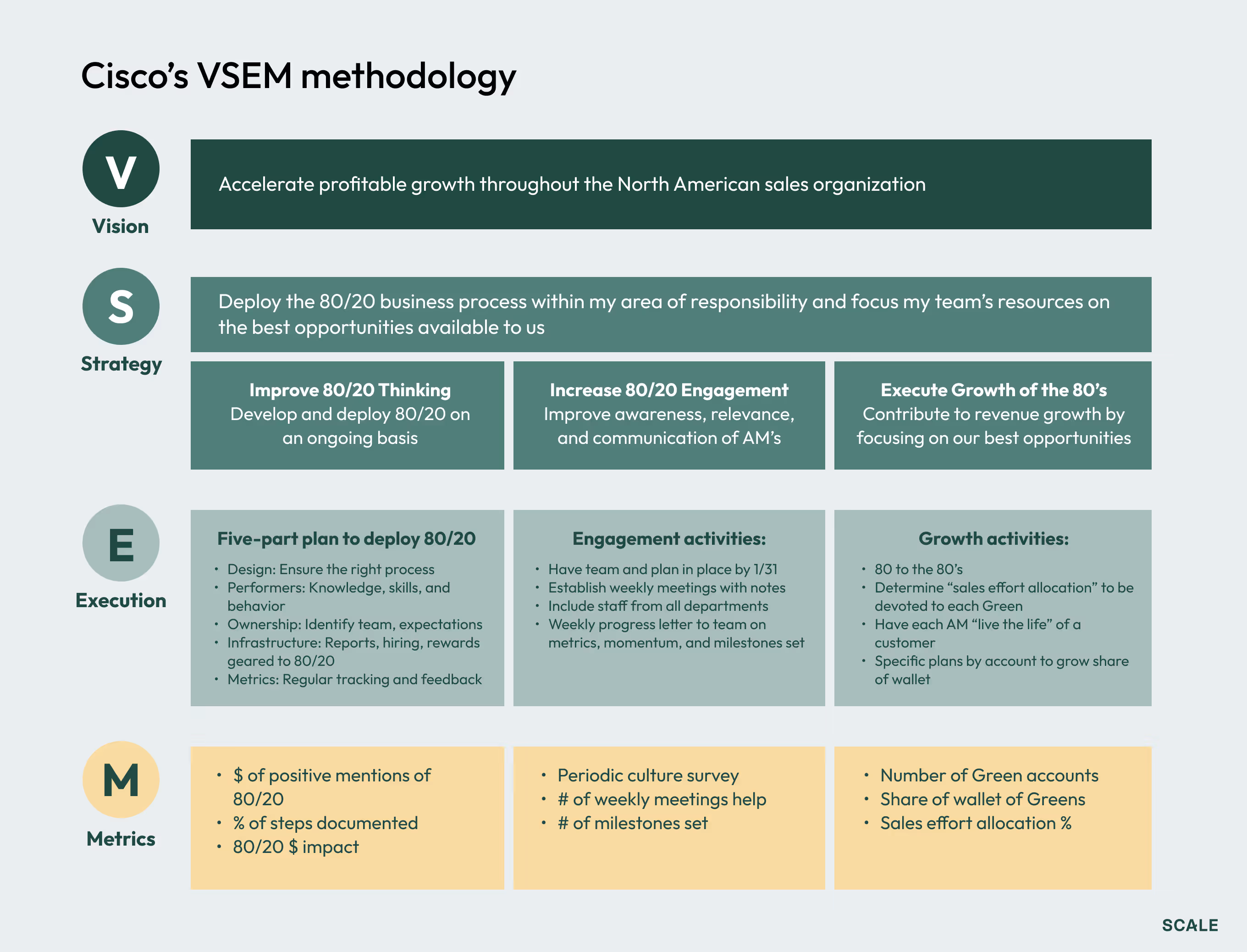 I really like Cisco’s framework Vision, Strategy, Execution, Metrics (VSEM) for its simplicity, and use objectives and key results (OKRs) in tandem. There are many good alternatives to these frameworks, but in VSEM, you start with the vision and mission of the company, then bring it down to a strategy that is a two-to-three-year plan. Then you break that three-year plan into one year and the big, cross-functional things to accomplish. That’s where OKRs can take over and you can document what everyone’s key results are over the next year, which tie your metrics.