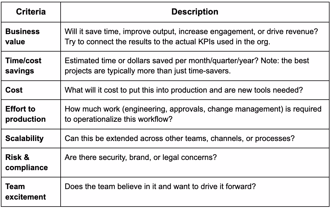 - Share the intent to drive AI fluency, reimagine marketing workflows, and identify projects that could materially impact output or efficiency