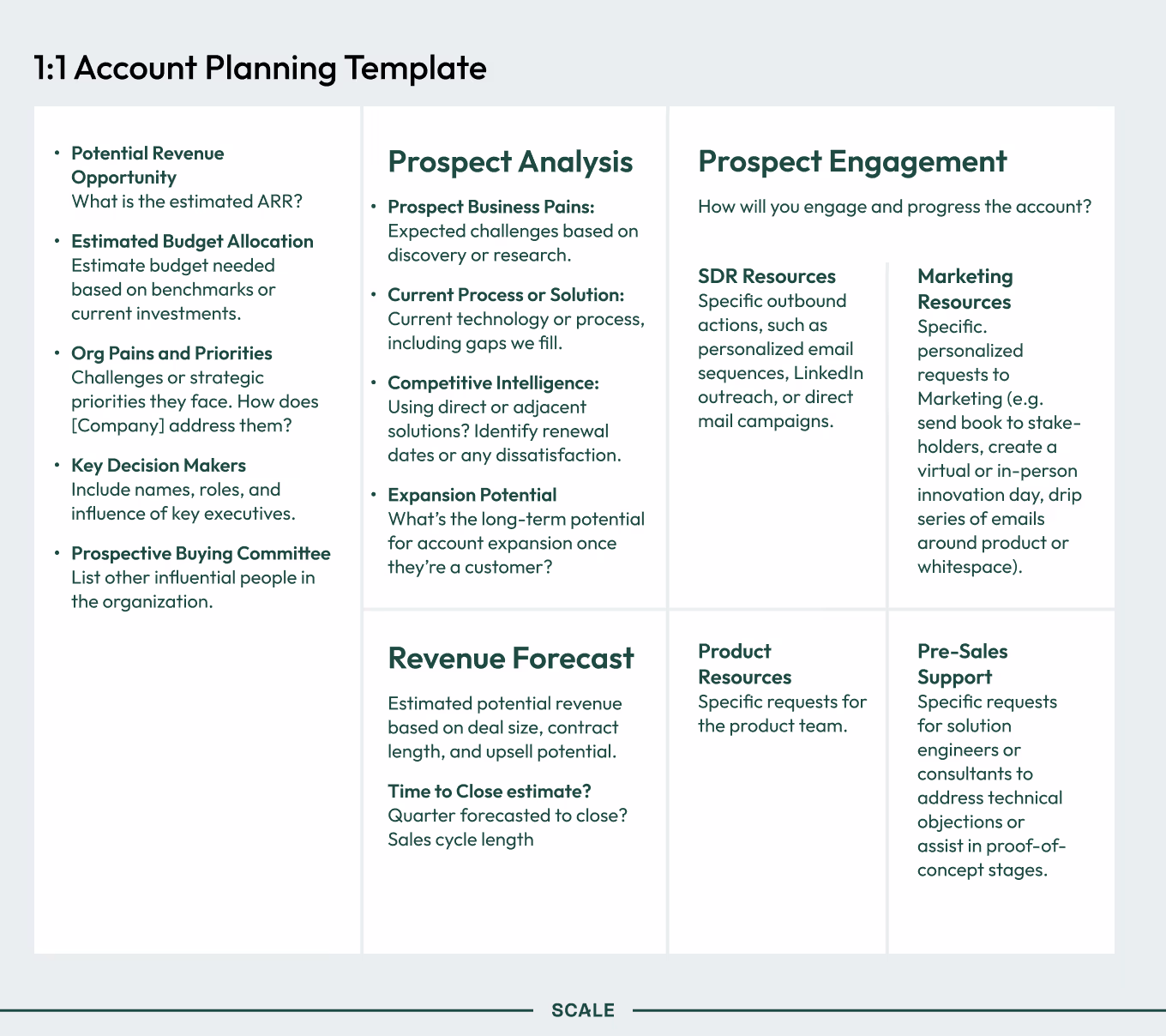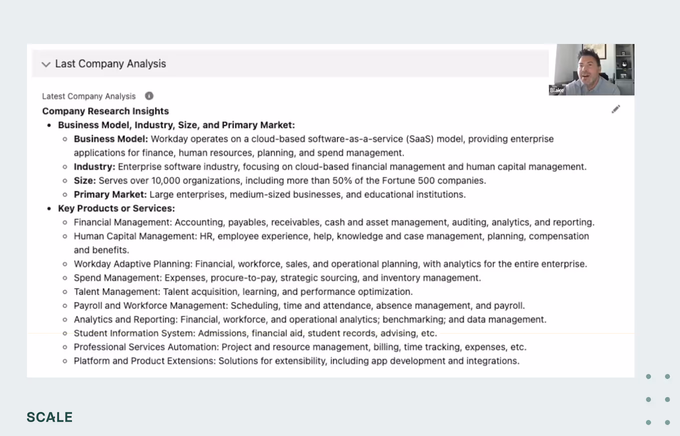 At SupportLogic, Blake found that the sales and sales development teams were doing research differently, and that within each team, every individual was doing research differently. When they launched an ABM initiative to target 100 in-market accounts, Blake wanted a uniform foundation that could power all their go-to-market activities.To start, Blake created a template for every seller to fill out and scheduled a twice-monthly pipeline sync. In that first meeting, he asked the account executives and sales development reps to fill out the template for five accounts in their top 25.Only one person filled out the template for one account, and it was only partially filled out. [video width="1280" height="720" mp4="https://www.scalevp.com/wp-content/uploads/2025/08/SVP-clips-AI-for-account-research-reps-weren_t-doing-the-research.mp4" poster="https://www.scalevp.com/wp-content/uploads/2025/08/SVP-thumbnail-GTM-AI-lab-Create-an-Accounts-plan.png"][/video]