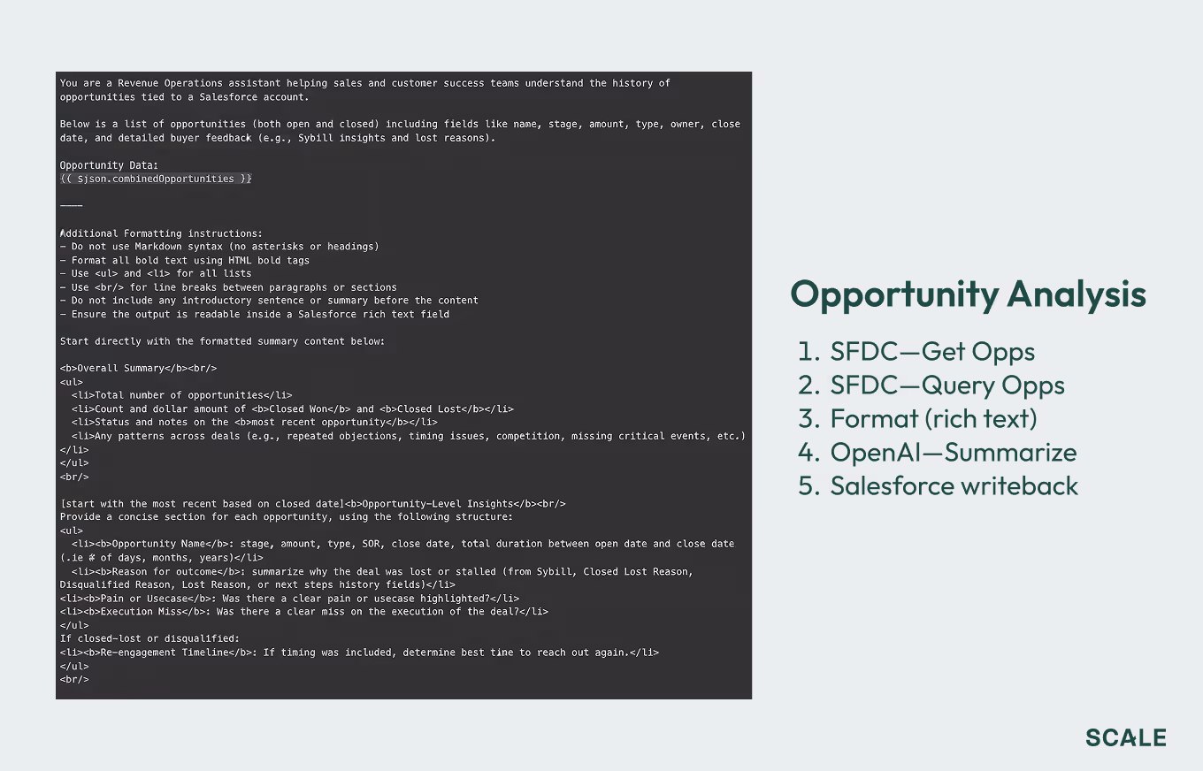 Nowadays, there are a plethora of no-code AI workflow tools available to the non-technical user: Zapier, n8n, Make.com, and others. There are also low-code Model Context Protocol (MCP) connectors that allow your LLM to push code into your software systems to run scripts, do their own research, and update fields. We believe this presages a near future where the go-to-market team’s work involves a lot less prompting and a lot more orchestration—figuring out how those prompts can work together to resolve actual jobs to be done.We cannot stress enough how important this advance is: You do not have to know how to code to achieve code-like effects, far faster than coding ever took. Below, we describe how Blake built his workflow. Things are advancing rapidly, so it’s already somewhat out of date. But you can use it as inspiration to follow the same logic for your particular goals.Be inquisitive. Search for templated workflows online (they are everywhere). Ask for help on our GTM AI Discord server. Have Claude or ChatGPT coach you through creating an n8n process to achieve your desired goal. The main thing is to just get started.Also, please note: The workflow explained below involves giving your LLMs read and write access to Salesforce, which carries a bit of risk. We recommend starting small and, if possible, testing in a sandbox environment. Blake is very comfortable with Salesforce, and so didn’t feel the need to take this precaution.Blake’s workflow is primarily built in Zapier, which Blake feels is a great place to begin automations like this: It’s no-code, linear, has a good interface, and is already approved within most organizations.