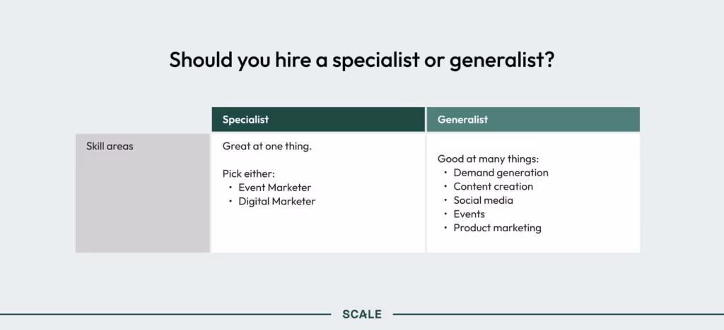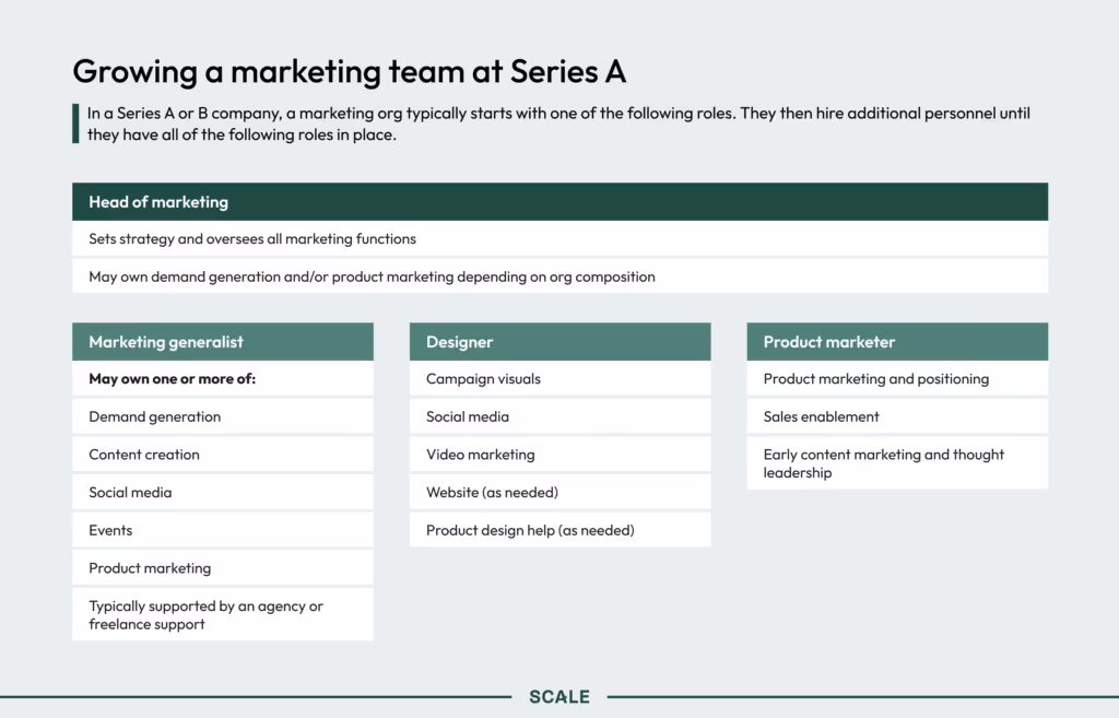 You’ll typically hire people to fill each of the above roles until you have all of them covered. If you already had an exceptionally strong marketing generalist or specialist on payroll during your seed stage, you might consider moving them into the head of marketing position. Otherwise, you’ll likely want to hire a head of marketing to oversee specialized functions like design and product marketing. Additionally, they can work with a more junior generalist to tackle everything else (demand generation, events, etc.).