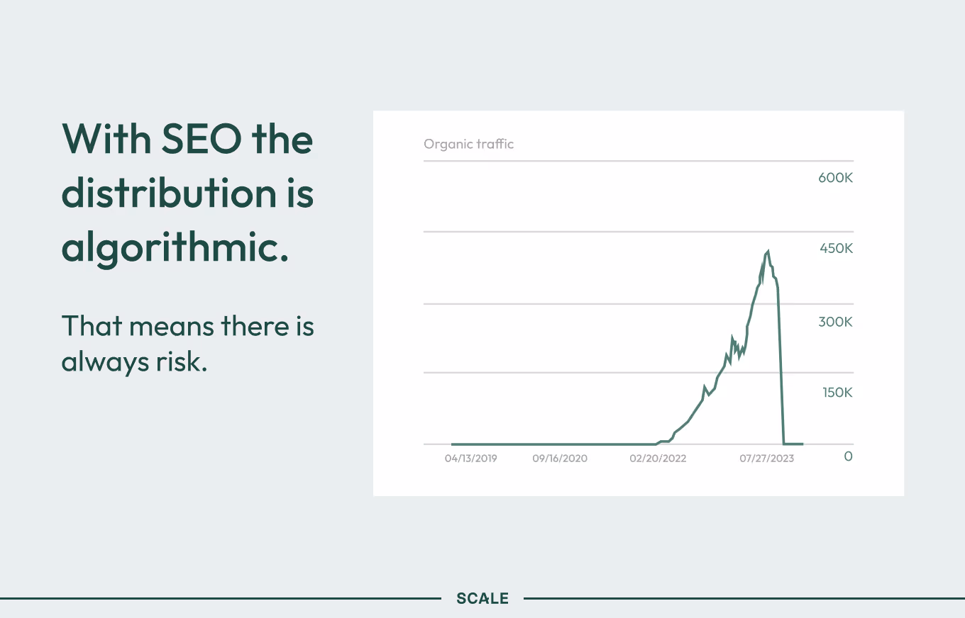 There has been a lot of poor SEO advice over the years and none so misguided as “write for the algorithm.” The algorithm is carefully watching what real people interact with; it is primarily guided by people. Google’s latest updates solidified this and it now harshly penalizes keyword stuffing.This means any company trying harder to game the algorithm than to serve readers will tend to face occasional cataclysmic drops in traffic. One company Growth Plays spoke with had spun up thousands of pages full of low-quality, AI-generated content. When Google released a major algorithm update, the company’s traffic plummeted from half a million monthly visits to virtually zero.Whereas other companies benefited from that same Google update, which gave greater priority to content that demonstrated “experience, expertise, authoritativeness, and trustworthiness.” These companies had been less focused on figuring out the nuances of the channel and more on writing things that served their buyers.That said, writing faithfully is still no guarantee of success. There is always inherent platform risk in relying on a stranger’s algorithm for distribution. Algorithms can change. This is why serving your buyer content they truly value is so important: If you can capture their attention, you earn the right to take them out of search (or AI) and integrate them into an owned audience.