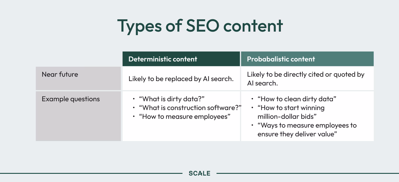 Perhaps you are thinking that writing about how to do the work sounds undifferentiated, and it may be. Attractive keywords today may be tomorrow’s AI-summarized, zero-click search results. This is a tricky balance to navigate and one to work with an SEO professional on, but our advice would be this: Contribute such helpful, authoritative, stark opinions that others are afraid to summarize, and instead quote you.For example, AI will likely summarize the term, “What is a go-to-market team?” But the variation, “The best way to staff a go-to-market team,” is so context dependent and so reliant on firsthand experience, you are more likely to serve up valuable information into the future.