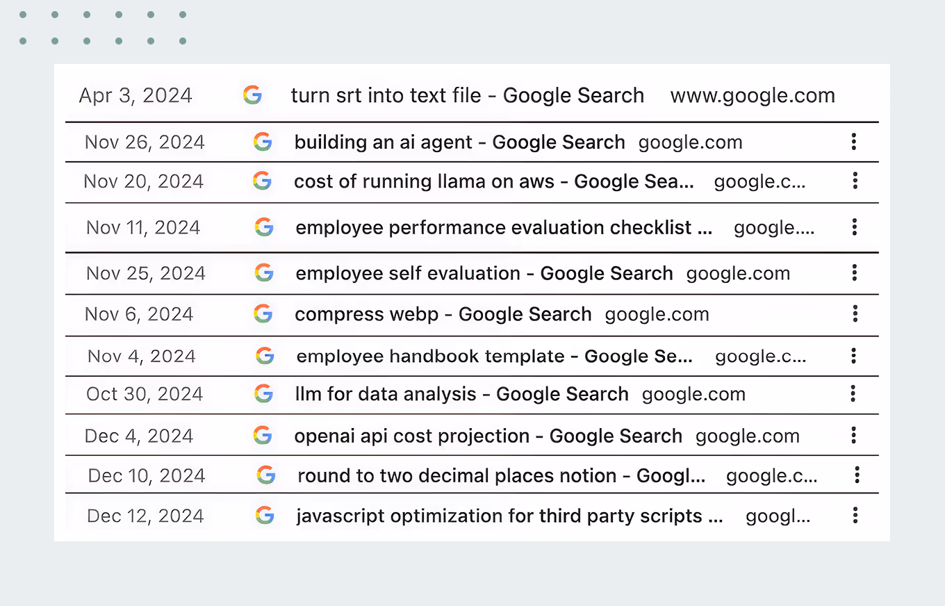 There are still many misconceptions about how buyers search for products online. John-Henry would encourage you to look at your own search history. Rather than the logical, methodical paths marketers like to depict on whiteboards, real queries form only a loose scatterplot. Searches for “invoicing software” are interspersed with searches for celebrities and how to convert a video into a GIF.Even better than looking at your own history, ask a peer who fits your ideal persona to let you view theirs. Pictured is an example of someone in the market for a new CMS, but who is looking for ways to compress images and improve site speed.