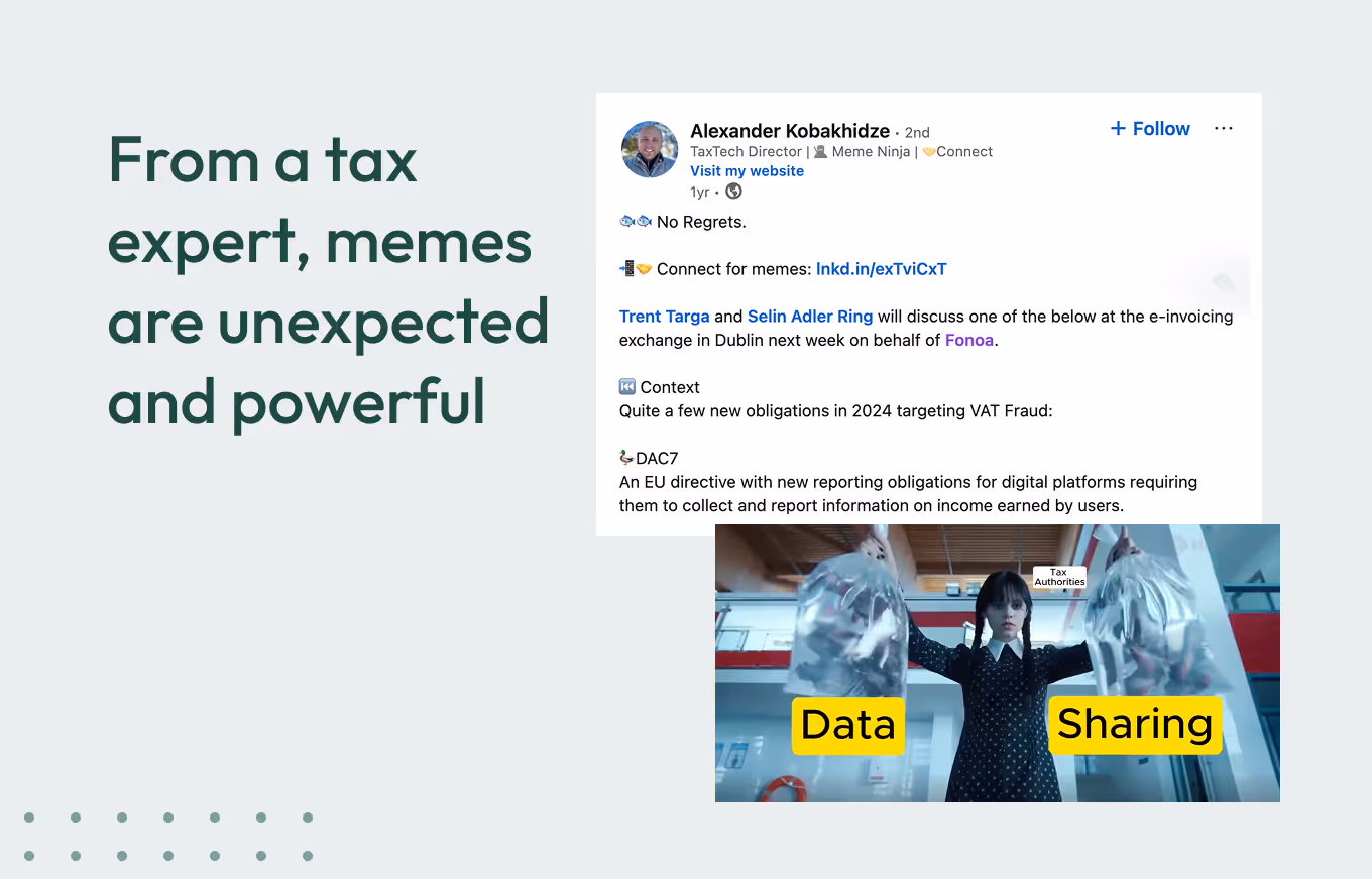 Fonoa noticed a gap in tax news from foreign countries, and its marketing provides a valuable service: It aggregates international updates into a tax regulation feed. They are “wrapping” others’ news into their own context, which is just as valuable to time-starved buyers as if they had invented it on their own. They also produce evergreen, traditional SEO-type content around running a tax-compliant business, but also memes, which are unexpected and fun.The memes work because Fonoa’s head of tax technology was formerly the head of tax at Uber. He knows his topics well and happens to be quite funny. Their target accounts often react to and comment on his posts.All three formats lead people back to Fonoa’s newsletter.